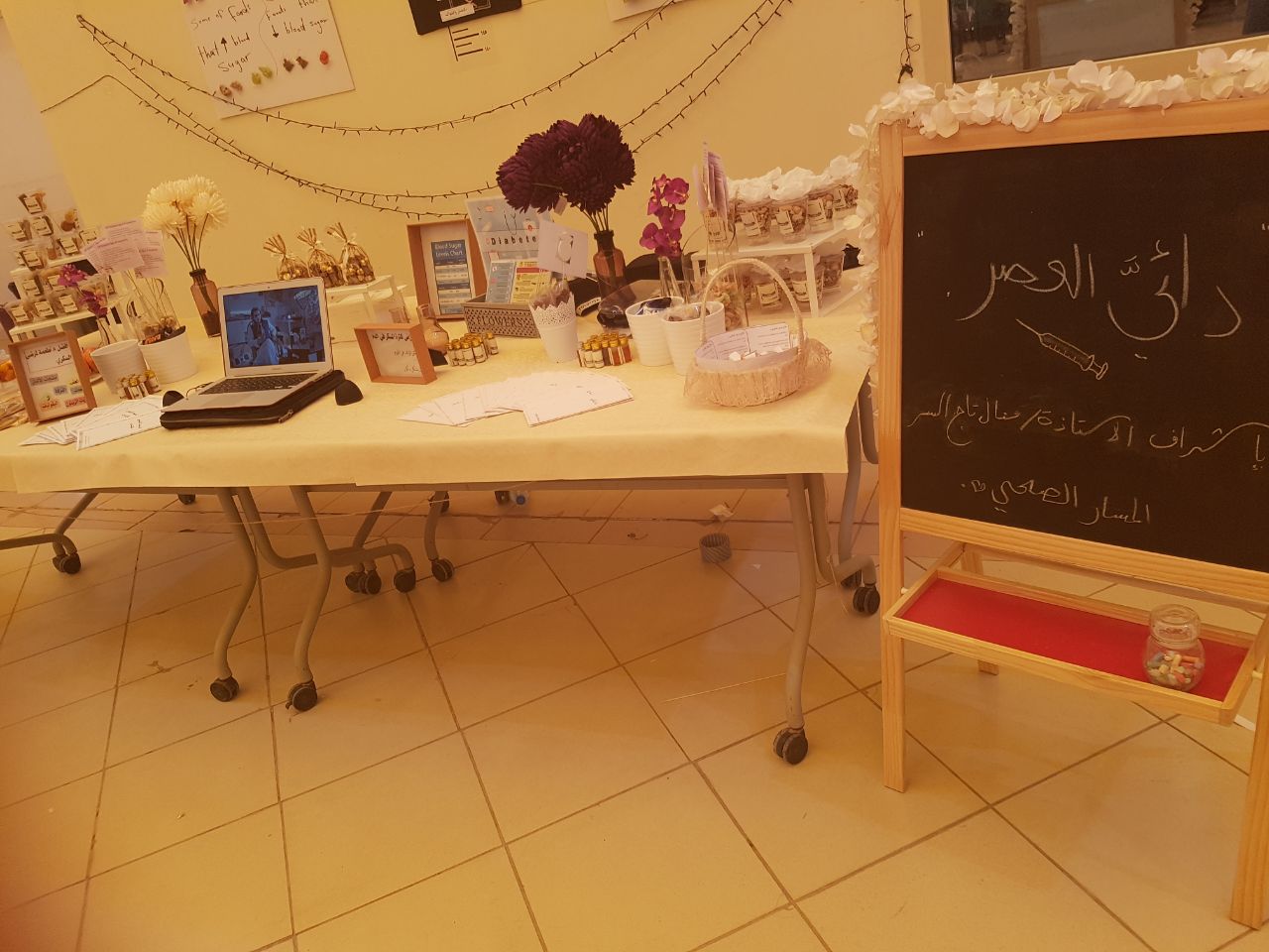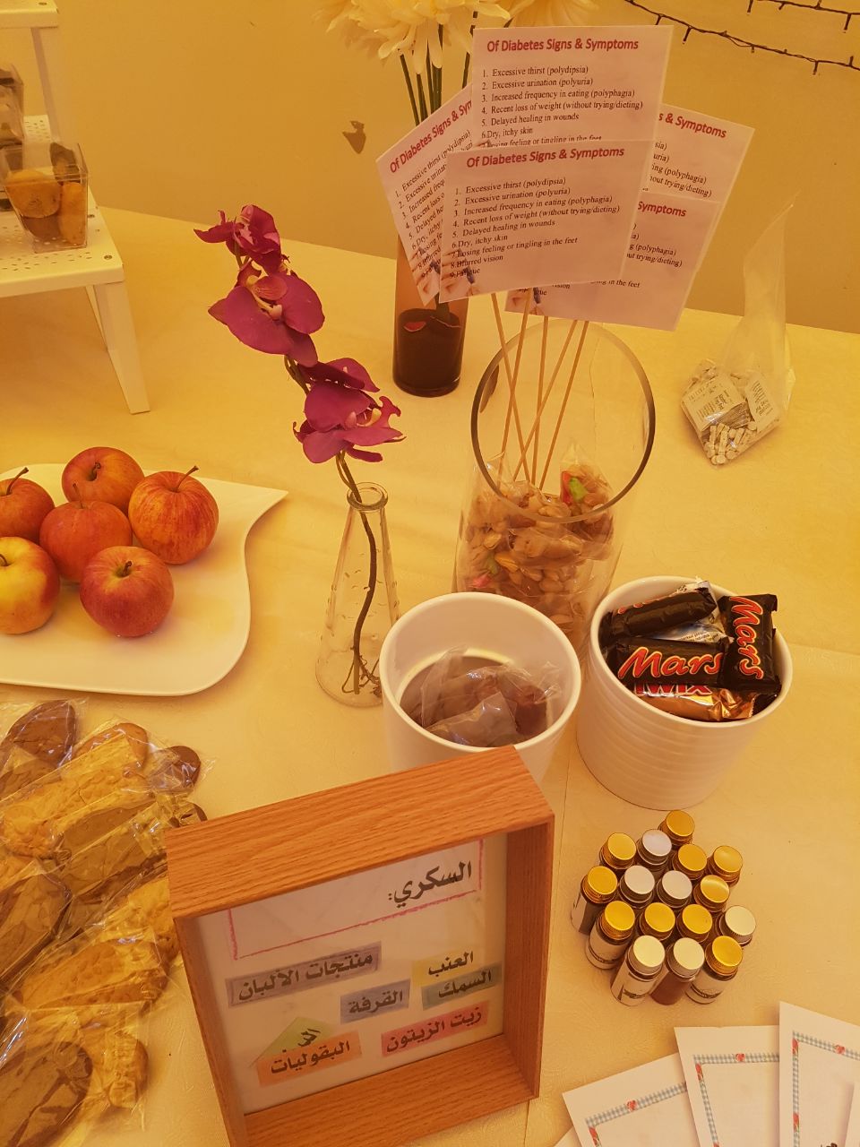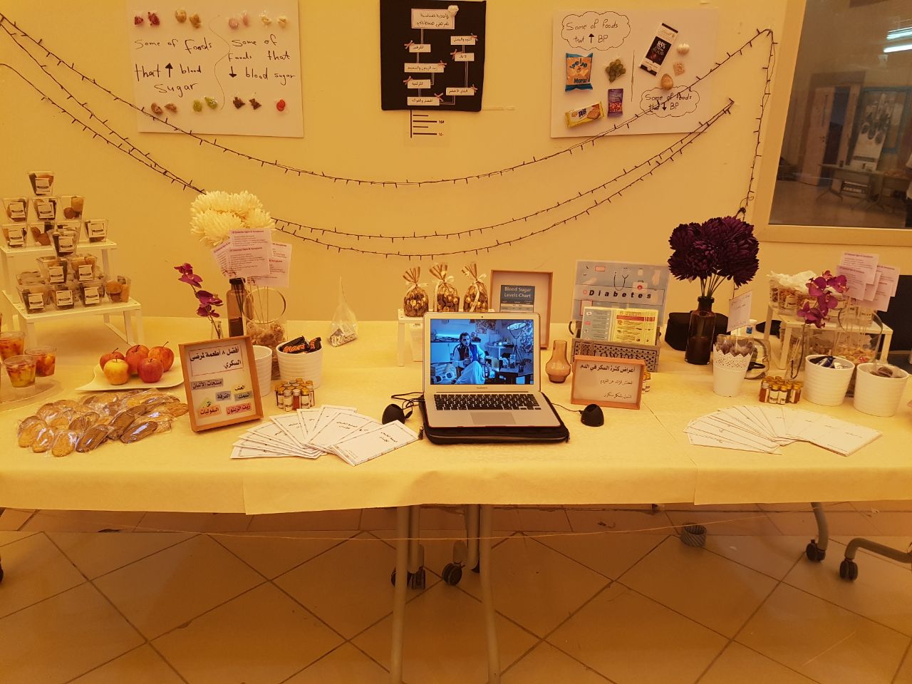وتم توزيع بروشورات ومطويات على الحضور تحتوي على معلومات عن الأغذية المناسبة التي تحافظ على مستوى السكر في الدم والتي على إثرها لاقت إعجاب واستحسان الحضور.