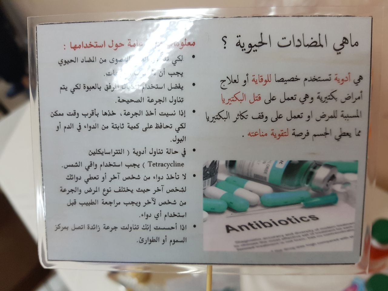 وتضمنت فعاليات الحملة قيام طالبات نادي العلوم الأساسية بعمل عرض توضيحي شمل مفهوم المضادات الحيوية واهم أنواعها وآثارها الجانبية وتفاعلها مع الأدوية الأخرى وسوء استخدامها.
