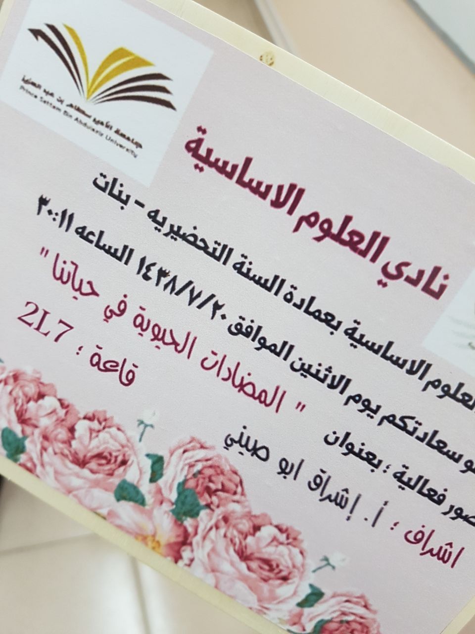 نظم نادي العلوم الأساسية بعمادة السنة التحضيرية- شطر الطالبات- يوم الاثنين الموافق 20/7/1438هـ فعالية بعنوان المضادات الحيوية في حياتنا تحت اشراف أ. اشراق أبو صيني. كما حضر الفعالية العديد من الطالبات ومنسوبات العمادة.