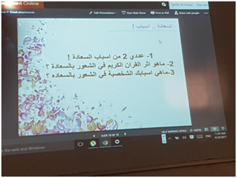حيث قامت طالبات نادي العلوم الأساسية بعرض توضيحي بين أسباب السعادة في الحياة وكيفية الحصول عليها و منها: السعادة بالتوحيد والإيمان بالله، ذكر الله عز وجل ومناجاته والقرب منه، العمل الصالح ، العطاء ، رضا الوالدين، السعادة في اليقين والثقة بالله عز وجل والتوكل عليه والرضا والقناعة وغيرها من أسباب السعادة.