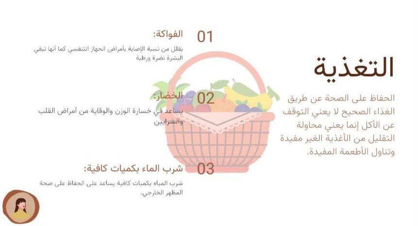 نظم نادي العلوم الأساسية بعمادة السنة التحضيرية - قسم الطالبات، فعالية بعنوان "صحة وجمال المرأة" يوم الأربعاء الموافق1443/2/23هـ الساعة 8 م، بإشراف أ. زهراء علي عبد الله، وبحضور منسوبات العمادة وطالباتها. في هذه الفعالية تحدثن الطالبات عن صحة وجمال المرأة وكيفية الحفاظ عليهما من خلال الالتزام بالتغذية الجيدة والاهتمام بالذات والنوم الكافي والرياضة. وهدفت هذه الفعالية إلى أن: