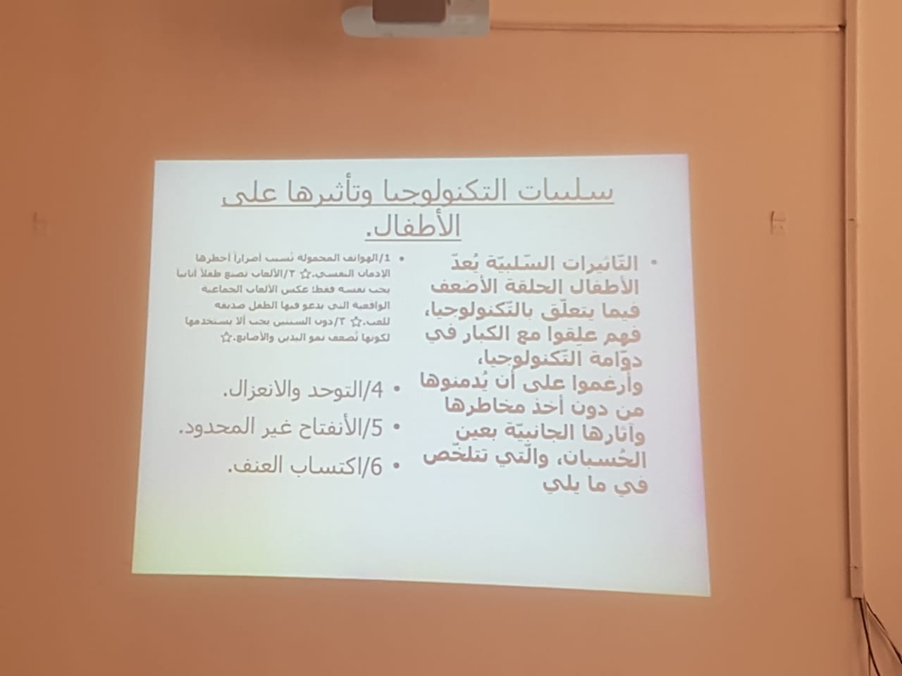 بحضور وكيلة عمادة السنة التحضيرية الدكتورة أمل الشمراني نظم نادي العلوم الأساسية بعمادة السنة التحضيرية قسم الطالبات يوم الخميس الموافق ٣٠/ ٢/ ١٤٤٠هـ ندوة بعنوان :(رعاية الطفل تحت تأثيرالتكنولوجيا) باستضافة أخصائيات من مركز السيح للرعاية النهارية وحضور منسوبات العمادة وطالباتها تحت إشراف الأستاذة رجاء عبد الفتاح و الأستاذة تهاني المحمود . وقد تضمنت فعاليات الندوة قيام طالبات نادي العلوم الأساسية بعمل عرض توضيحي شمل التعريف بالتكنولوجيا في حياتنا بشكل عام وكيف تؤثر على الأطفال بشكل خاص. كما تحدثن عن ايجابياتها كالتعليم الالكتروني للأطفال ( لغات- قراءة الكتب والقصص ،وتنمية مهارات الطفل الاجتماعية وتنمية مواهبه , وسلبياتها كالتوحد والانعزال عن العائلة - والأضرار الصحية المتعددة - والانفتاح غير المحدود- واكتساب العنف- واكتساب الخوف. كما تحدثت أخصائيات العلاج النفسي وأخصائية العلاج الوظيفي عن تأثير التكنولوجيا على نفسية الطفل وشرح بعض حالات الأطفال التي مرت عليهم بالمركز. كما تضمنت الندوة توزيع بروشوراتٍ ومطوياتٍ على الحضور تحتوي على إيجابيات وسلبيات التكنولوجيا وكيف نحد من خطرها على الأطفال. واختتم اللقاء بكلمة من الأستاذة رجاء عبد الفتاح شكرت فيها أخصائيات مركز السيح للرعاية النهارية لتكرمهن بالحضور وماقدموه من معلومات قيمة أثرت الندوة ، كما شكرت جميع الحضور ووجهت كلمة تشجيعية للطالبات المشاركات فى تنظيم الندوة وعلى مجهودهن اللافت.