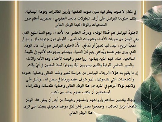 هناك حكمة قديمة تقول: إنه من عاش لنفسه قد يرتاح، لكنه يعيش صغيرًا ويموت صغيرًا، ومَن عاش لدينه ولغيره قد يتعب، لكنه يعيش عظيمًا ويموت عظيمًا، فهذا قارون عاش لنفسه فقط، فكانت النتيجة خسف الله به وبداره الأرض. ومن هذا المنطلق نظم نادي العلوم الأساسية بعمادة السنة التحضيرية -قسم الطالبات، محاضرة بعنوان"لا يستحق الحياة من عاش لنفسه" وذلك يوم الأثنين 1442/2/25هـ، تحت إشراف وتنظيم أ. زهراء علي عبد الله، تحدثت طالبات النادي في هذه المحاضرة عن صفة الأنانية والتي بها يعيش المرء لنفسه فقط ولا يهتم بمن حوله. وعرضن نماذج تتجلى فيها صفة الإيثار لأشخاص يقدمون حياتهم وأرواحهم فداءً لغيرهم. وذكرن مهنة الجندي وما يقدمه من أجل حماية وطنه. وكذلك دور المعلم والطبيب. كما تم عرض بعض الفيديوهات للجنود وهم يؤدون رسالتهم بكل بسالة وشجاعة. واختتمت الفعالية بكلمه من أ. زهراء علي شكرت فيها الحضور والطالبات على جهودهن المتميزة وتمنت لهن مزيدا من الابداع.
