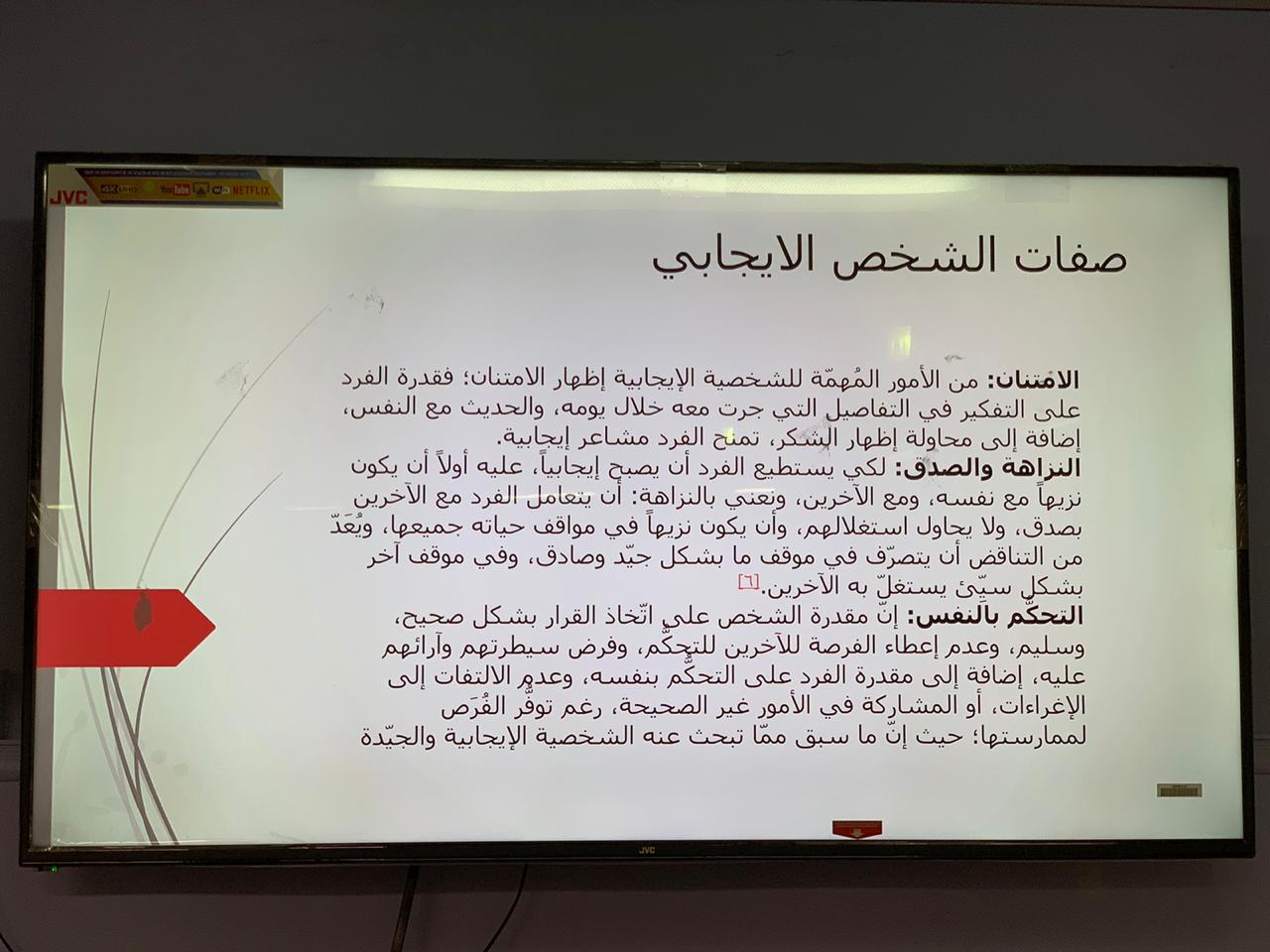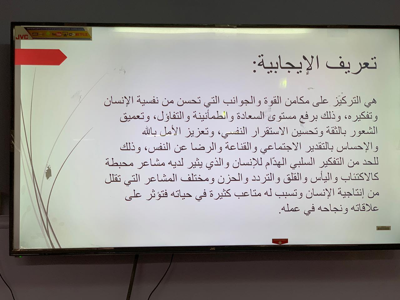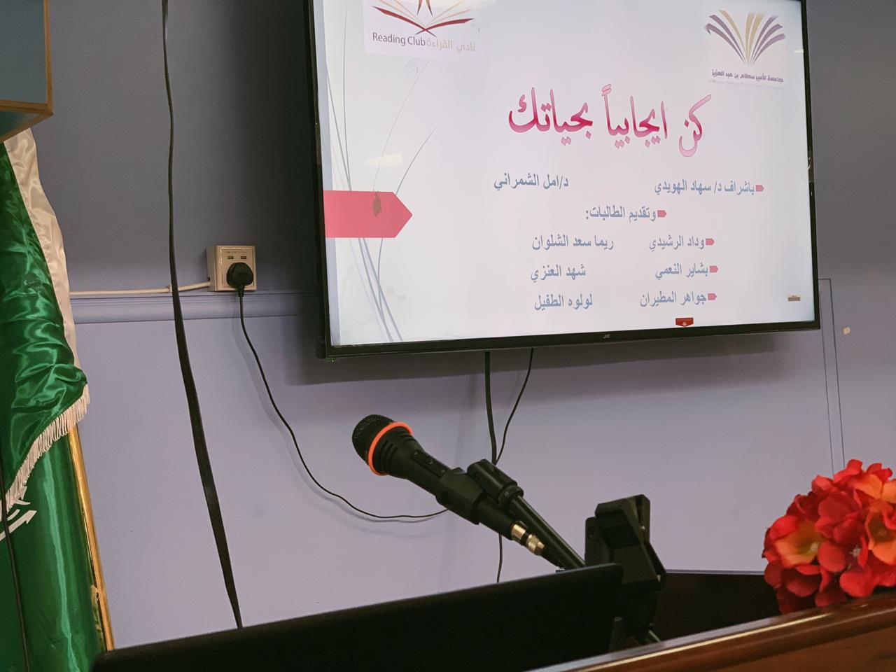 للجامعة بشكل خاص والسلك التعليمي بشكل عام، دور كبير في نشر روح التفاؤل والطاقة الإيجابية، ليس فقط داخل اسورتها، بل أيضا بين المجتمعات الخارجية، من خلال ما تقدمه من أنشطة وبرامج علمية هادفة، وسعياً من عمادة السنة التحضيرية - قسم الطالبات - في تحقيق الهدف المنشود وراء ذلك، فقد أقامت طالبات نادي القراءة بإشراف الأستاذة سهاد الهويدي، حلقة نقاشية في مدرسة الثانوية التاسعة بعنوان "كن إيجابياً بحياتك" يوم الخميس الموافق ١٤٤١/٠٤/1هـ. ابتدئت الحلقة بالحديث عن أهمية القراءة، وكيف أنها تنمي الفكر وتغذي العقل، وتجعل من الشخص القارئ أكثر وعياً وذا نظرة إيجابية. اعقب ذلك الحديث عن الهدف المنشود وراء هذه الزيارة وهي كيف يكون الشخص إيجابياً في حياته، حيث استعرضت الطالبات نقاط عدة عن تعريف الإيجابية وماهيتها، وكيف يكون الشخص إيجابياً، وصفات الشخص الإيجابي، وأثر ذلك على المجتمعات. صحب هذه الفقرات عرض توضيحي من اعداد طالبات النادي. واختتمت الحلقة بتوزيع بروشورات خلال الحملة التي شملت العديد من المبادئ التي من شأنها أن تجعل أي شخص طموح يصل من المكان الذي هو فيه إلى المكان الذي يرغب في أن يكون فيه، في مختلف جوانب الحياة. كما تم تسليط الضوء خلال الحلقة النقاشية على كيفية الاستعداد بشكل دائم من أجل اغتنام الفرص عندما تدق أبواب أصحابها، وكيفية تنمية التفكير الإيجابي لدى الأفراد في الحياة وتحفيز الذات.