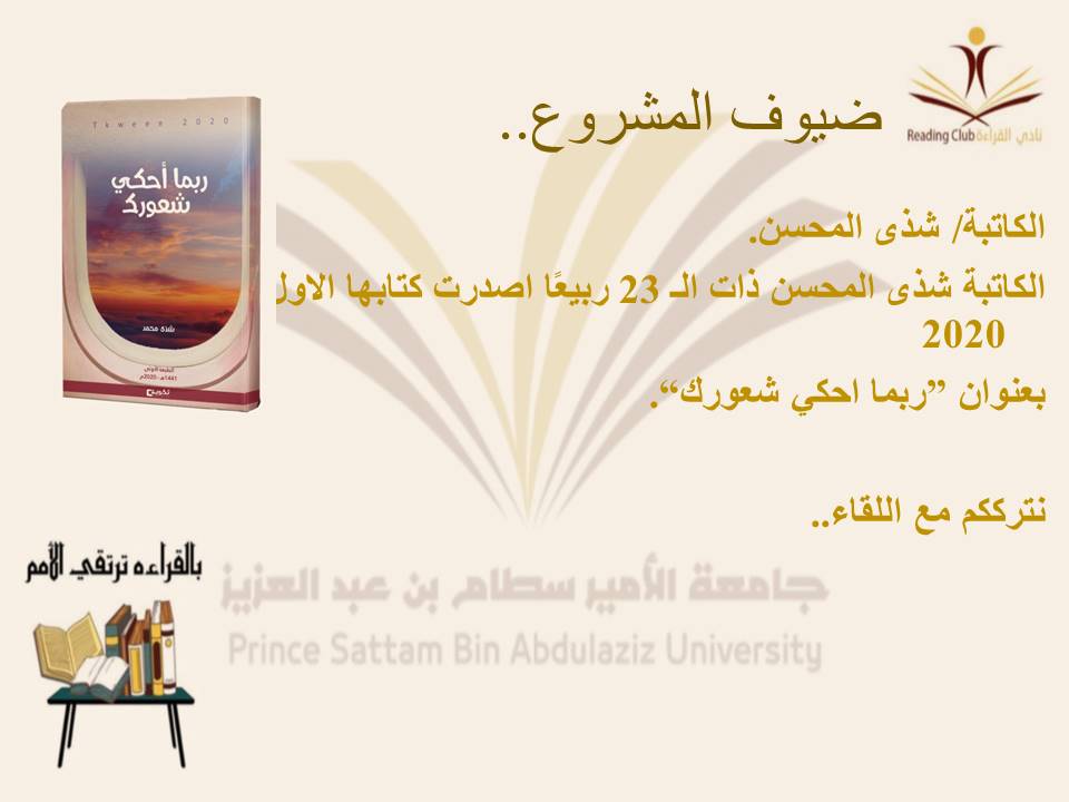 استكمالاً لتحقيق أهداف نادي القراءة في عمادة السنة التحضيرية- قسم الطالبات بنشر ثقافة القراءة في أوساط الطالبات ومنسوبات العمادة، أقام النادي ندوة بعنوان "بالقراءة ترتقي الأمم" عبر منصة البلاك بورد، وذلك يوم الخميس الموافق 21-2-1442هـ. تضمنت الحملة عبارات تشجيعية على القراءة، حيث تعتبر القراءة من أهم الأنشطة التي تحفز دماغ الإنسان، كما أنها تعمل على تطوير قدرات الفرد على التحليل والتواصل، وتعمل على تقوية الوصلات العصبية لدماغ الإنسان وتعزز التركيز لدى الفرد من خلال قراءة النصوص وتحليلها والتأمل والتفكير فيها، وأخيراً تساهم في تنشيط الذاكرة وتزيد من نشاط القارئ الذهني. كما تضمنت الندوة استضافة الكاتبة شذى المحسن والتي تكلمت عن كتابها بعنوان” ربما أحكي شعورك“بأسلوبها الشيق الذي نال اهتمام الطالبات واستحسان الحضور. وفي الختام قدمت طالبات نادي القراءة نصائح وجهت لطالبات العمادة تبين أهمية القراءة فهي غذاء الروح والعقل فلا تهمل ذلك النشاط العقلي.
