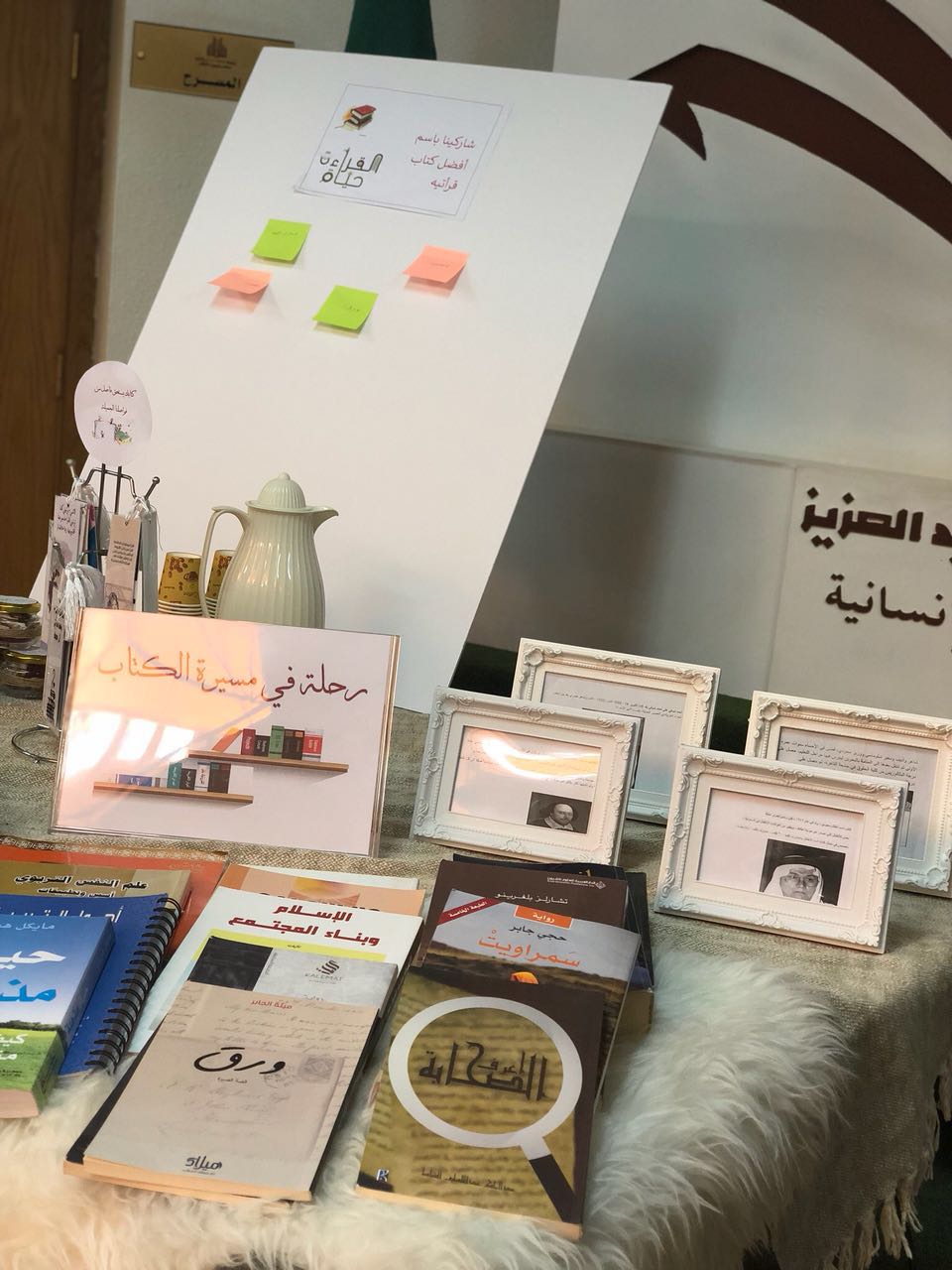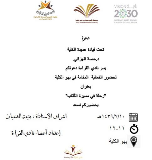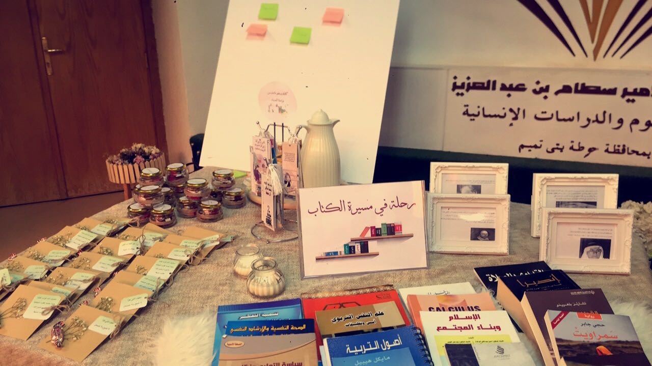 تحت رعاية عميدة كلية العلوم والدراسات الإنسانية بحوطة بني تميم د. حصة بنت سعود الهزاني نظم نادي القراءة متمثلاً بمشرفته أ.بثينه الضفيان فعالية (رحلة في مسيرة الكُتابْ(. قمن بإعدادها أعضاء نادي القراءة خلال يوم الثلاثاء –الموافق 10/7/1439 هـ – (11:00 م – 12:00 م) في بهو الكلية. يهدف البرنامج إلى تعريف الطالبات بمسيرة مجموعة من الكتاب ليحذوا حذوهم في المستقبل وكذلك تضمن الركن على مجموعة من الكتب بمختلف المجالات (الروائية، العلمية، الأدبية، النفسية، وكذلك الدينية) بهدف استعارتها والاستفادة منها. كما تضمن الركن لوح جداري يتم فيه وضع توصيات على أفضل الكتب المقروءة من قبل الطالبات ليتسنى للجميع الاطلاع عليها مستقبلاً. تم تقديم القهوة الساخنة والتوزيعات للزوار. وقد بلغ عدد الحاضرات 47 من الطالبات وأعضاء هيئة التدريس والموظفات بالكلية وقد كن الحاضرات أكثر حماسا ًوتفاعلاً، وقد تمت الفعالية بنجاح ولله الحمد
