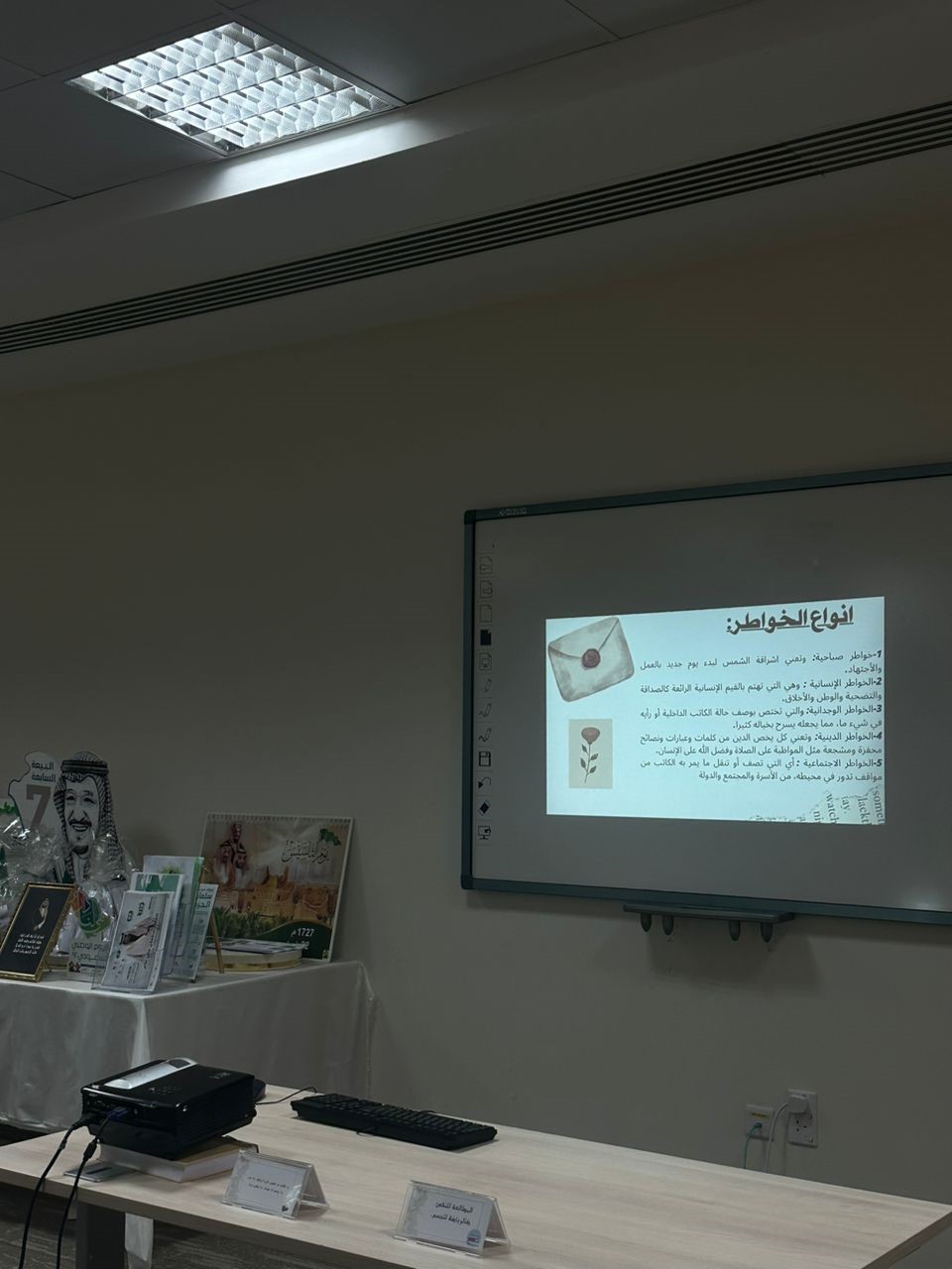 نظمت نادي القراءة في كلية العلوم والدراسات الإنسانية بالسليل، فعالية عبارة عن ورشة عمل بعنوان "كتابة الخاطرة" وذلك في يوم الخميس بتاريخ 18/7/1444ه الساعة 11 صباحاً ، وقد حضر الورشة عدداً من منسوبي الكلية من الطالبات، وقدمتها الطالبة / ريوف هجرس صالح.