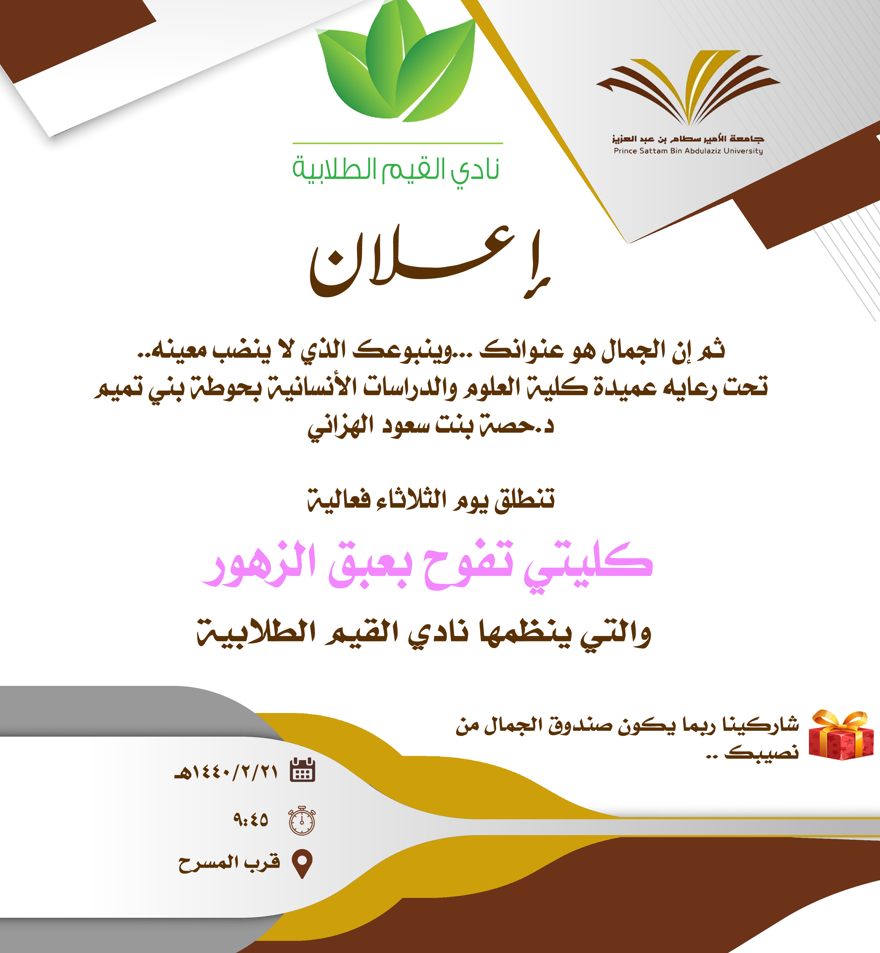 في بادرة صباحية جميلة أضافت الكثير من النشاط والجمال لصباح يوم الثلاثاء 21 / 2/ 1440 هـ الساعة العاشرة صباحاً وبالقرب من مسرح الكلية، نظّم نادي القيم الطلابية بكلية العلوم والدراسات الإنسانية بحوطة بني تميم بإشراف الأستاذة روان التميمي فعالية (كليتي تفوح بعبق الزهور). تهدف الفعالية إلى تعزيز قيمة الجمال الداخلي والحسي في نفوس الطالبات وأنهنّ رمز جمال كلية وأريجها الفواح. كما أقيمت ضمن فعاليات البرنامج مسابقة "سر الجمال" وقد شارك فيها عدد من الحضور. هذا وقد لاقت هذه الفعالية حضوراً وتفاعلاً كبيرين من طالبات الكلية ومنسوباتها