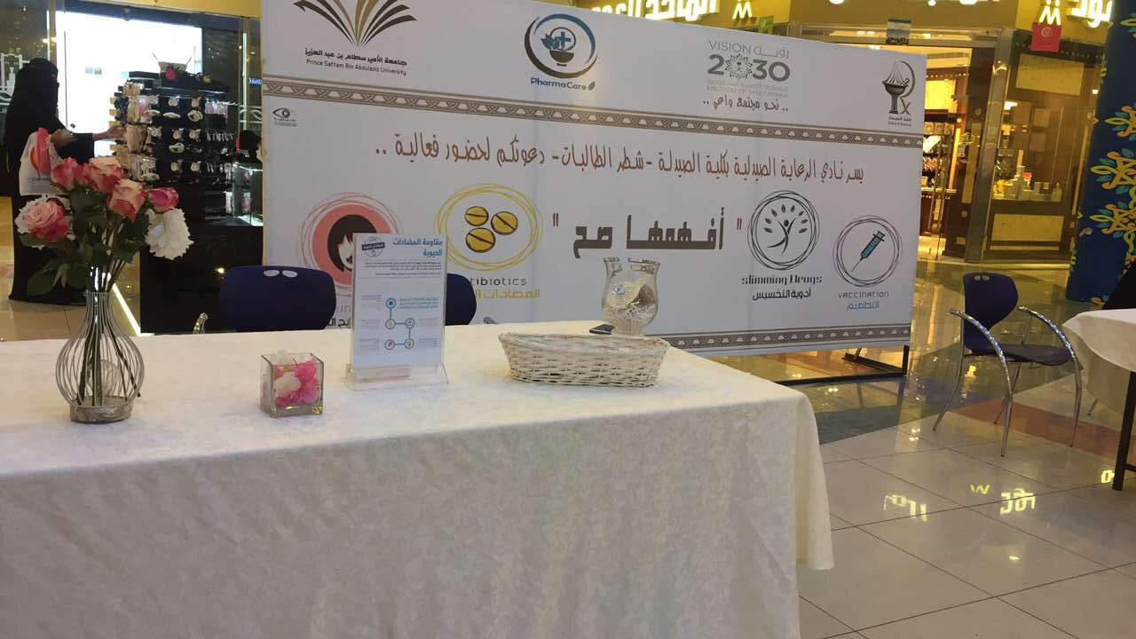 نظم نادي الرعاية الصيدلية في كليه الصيدلة شطر الطالبات بجامعه سطام بن عبد العزيز بالخرج فعالية بعنوان " افهمها صح " وذلك يوم الجمعة الموافق 9/8/١٤٣٨ بالحديثي مول بهدف تصحيح بعض المفاهيم الخاطئة والمنتشرة بين الأفراد وقد إشتملت الحملة على 4 أركان رئيسية وهي : ركن المضادات الحيوية ويشمل التعريف بطرق الإستخدام الأمثل للمضادات الحيوية، ركن التطعيمات ونفي الشائعات المنتشرة حولها والتوعية حول أهميتها، ركن أدويه التخسيس وتشمل نبذة عن بعض الأدوية التي توضع مع خلطات التخسيس بهدف إنقاص الوزن بغض النظر عن ضررها على الجسم ، ركن كريمات التفتيح وحقيقة مكوناتها وأضرارها على المدى البعيد صاحب هذه الاركان معلومات و نشرات تحوي على معلومات قيمه حول هذا الموضوع ،وقد لاقت الفعالية قبول وحضور عالي.