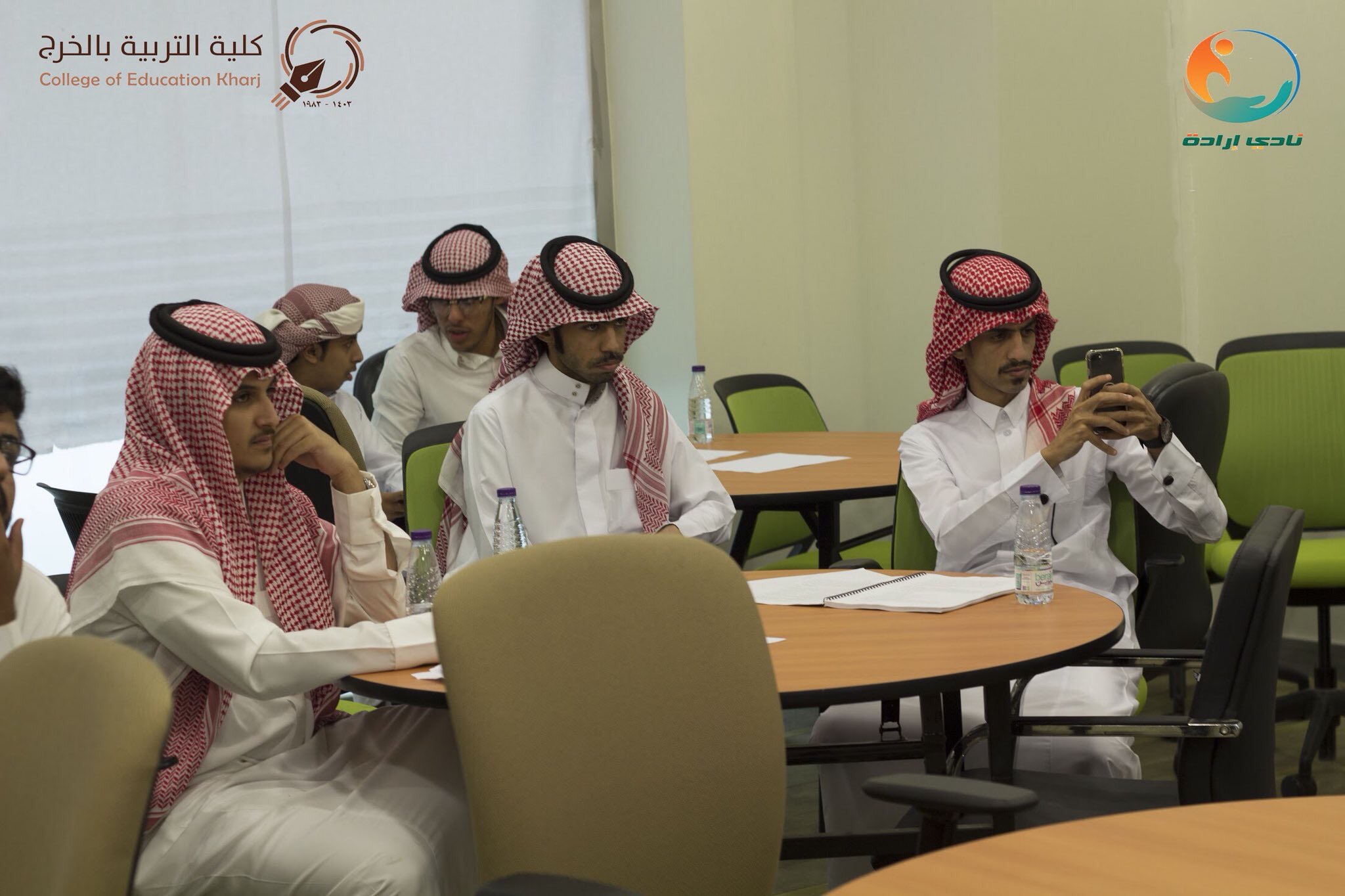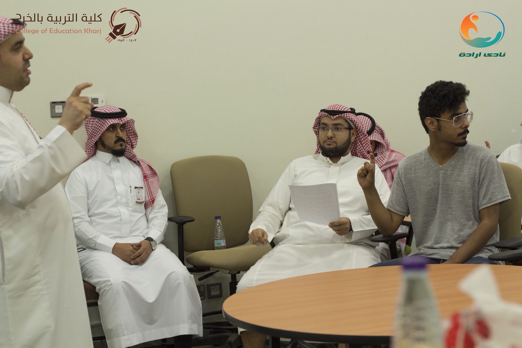أقام نادي إرادة بكلية التربية بالخرج التابع لعمادة شؤون الطلاب دورة تدريبية بعنوان (لغة الإشارة وثقافة الصم) يوم الثلاثاء 24-7-1439. حيث قدم الدورة سعادة الدكتور عبدالهادي العمري المتخصص والمترجم في لغة الإشارة. والتي ركز فيها على ثقافة الصم وطريقة التواصل مع الأفراد الصم. شملت هذه الدورة تعليم أبجدية الأصابع المستخدمة في الأسماء وإشارات الألوان وأفراد العائلة والأشهر والأوقات. كما شملت الإشارات المستخدمة في التحية والقبول والرفض. حضر هذه الدورة عدد من طلاب جامعة الأمير سطام وطالب من جامعة الجوف وعدد من أعضاء هيئة التدريس. في نهاية الدورة كرم أعضاء النادي الدكتور عبدالهادي العمري.