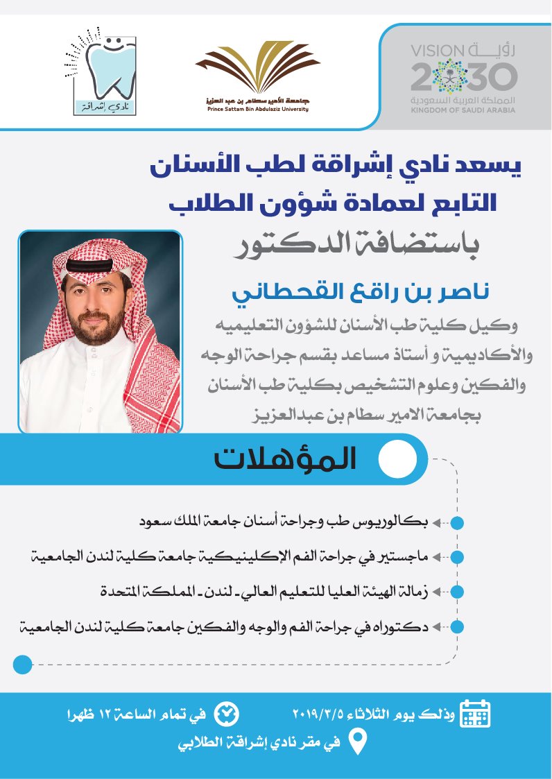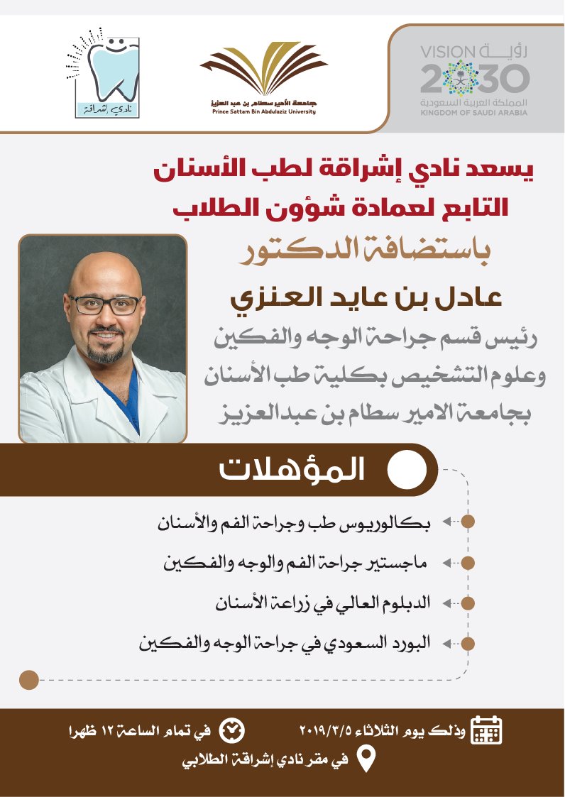 حيث يستضيف النادي يوم غدٍ الثلاثاء الموافق 28 / 6 / 1440هـ في تمام الساعة الثانية عشر ظهرا ًبمقر النادي بكلية طب الأسنان , وكيل كلية طب الأسنان للشؤون التعليمية والأكاديمية وأستاذ مساعد بقسم جراحة الوجه والفكين وعلوم التشخيص الدكتور ناصر بن راقع القحطاني , وكذلك الدكتور عادل بن عايد العنزي رئيس قسم جراحة الوجه والفكين وعلوم التشخيص بكلية طب الأسنان بالجامعة.