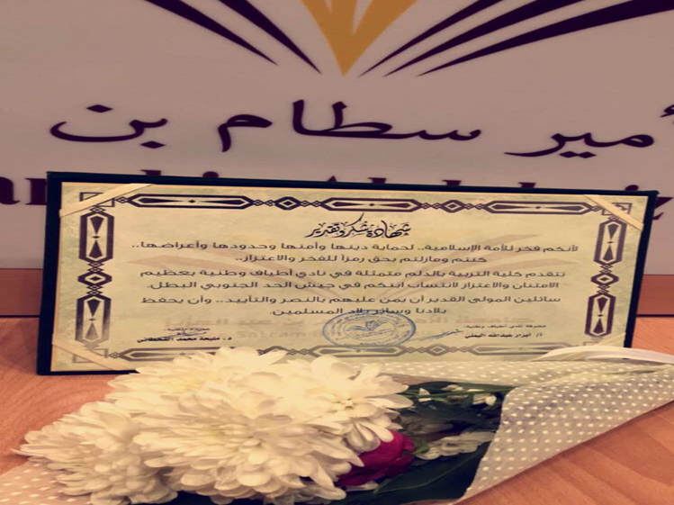 وفي الختام تم تكريم أهالي الجنود المرابطين بشهادات الشكر والتقدير ، مع ذكر أسماء الجنود، وصلة القرابة، وذلك لرفع معنوياتهم.