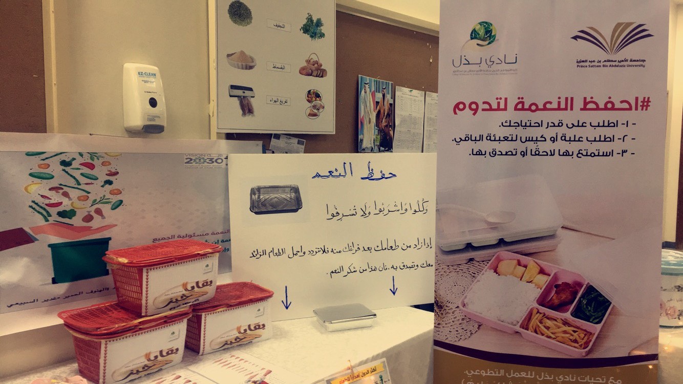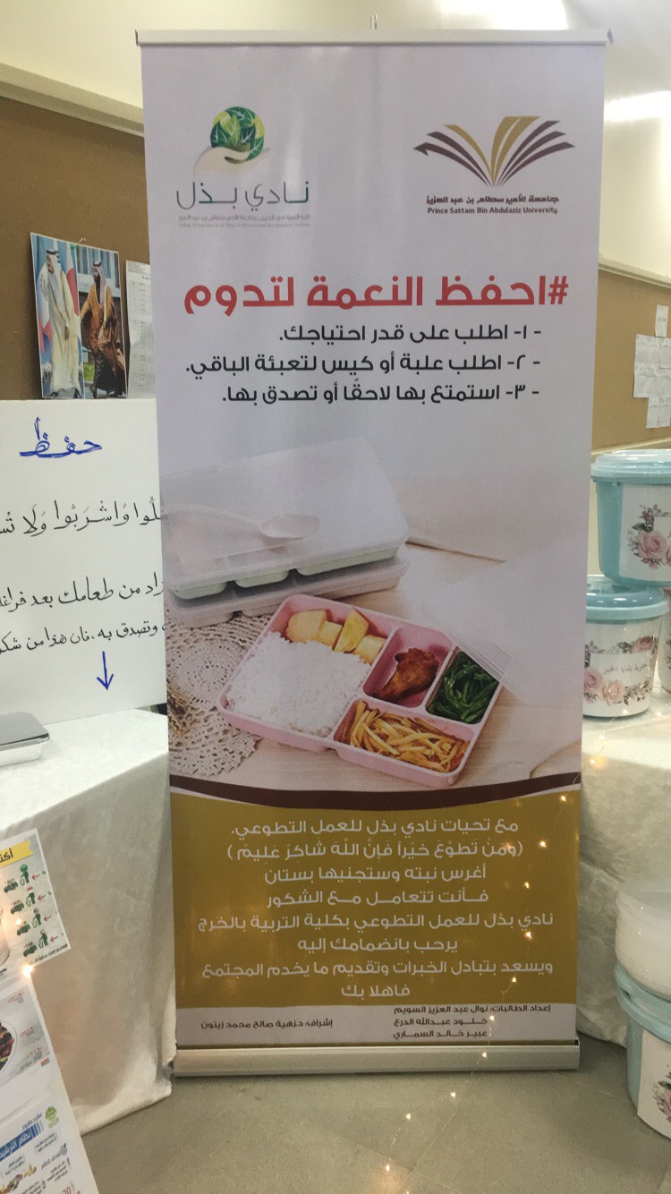 أطلقت وحدة العمل الطلابي بكلية التربية بالخرج بجامعة الأمير سطام بن عبدالعزيز الحملة التعريفية بالأندية الطلابية وكان ذلك يوم الأربعاء الموافق 23-1-1440هـ, وكان من بينها نادي بذل التطوعي بقيادة الدكتورة/ زهيه صالح زيتون الطيب الأستاذ المساعد بقسم علم النفس ومجموعة من طالبات الكلية وقد قدم النادي حملة حافظي على النعم لتدوم وذلك لتوعية الطالبات بضرورة ترشيد الاستهلاك في الطعام والماءوتوزيع مجموعة من السلال في أماكن جلوس الطالبات خاصة بتجميع بقايا الخبز والطعام ونشرات توعوية لحث الطالبات على التطوع والحفاظ على نعم الله التي لا تعد.