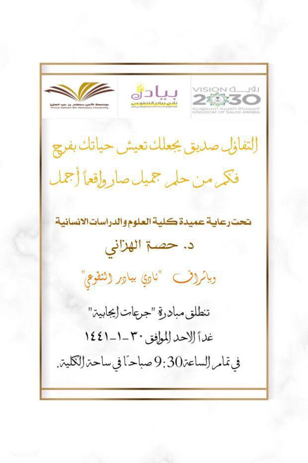 مع حفنة من الروح الإيجابية يتحقق الحلم وتزدان الحياة، بتطوع طالبات نادي بيادر التطوعي، بقيادة سعادة عميدة كلية العلوم والدراسات الإنسانية بحوطة بني تميم د. حصة بنت سعود الهزاني، اقام نادي بيادر التطوعي مبادرة "جرعات إيجابية" في صبيحة يوم الأحد الموافق: 1441/1/30 هـ وتحديداً الساعة التاسعة والنصف صباحاً بساحة الكلية وستمتد لشهر متواصل، أقيم ركن تعريفي للمبادرة تهدف إلى نشر الروح الايجابية، وتشجيع الطالبات على السعي ومواصلة السير لأحلامِهن، ومن خلال هذه المبادرة تعرفت الطالبة على أوجه الإيجابية المتعددة: كالامتنان و اللطف إلى جانب البساطة والقبول والصدق وصنع الفرح، وكيفية ترك بصمة فعّالة في أسرتها ثم مجتمعها. وشهدت المبادرة حضوراً تفاعلياً من جميع منسوبات الكلية.