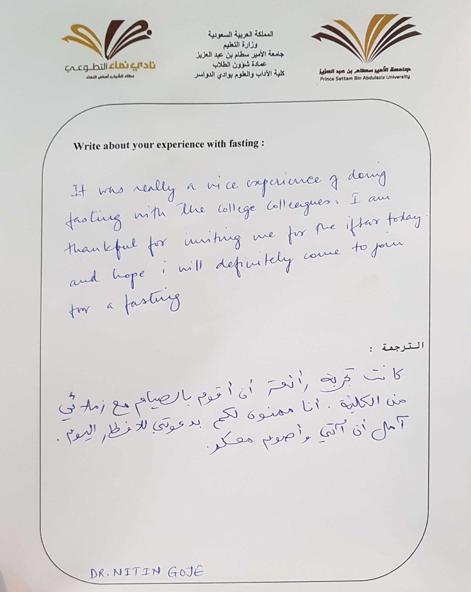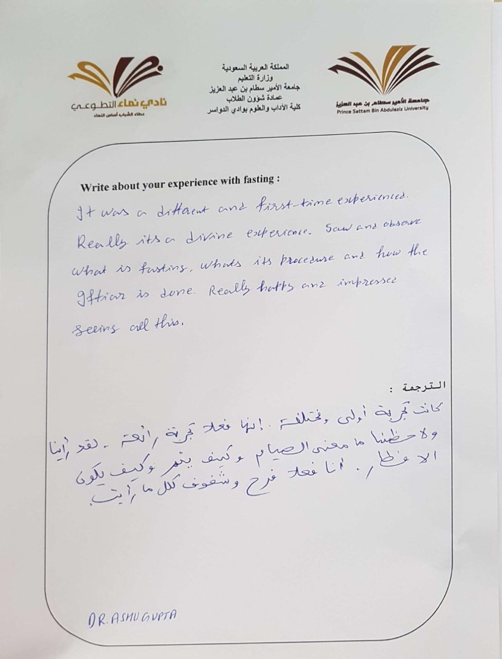 وأكد الحاضرون من غير المسلمين أن يومهم خلال الصيام كان مختلفا جداً من الناحية الصحية على الرغم من الصعوبات التي واجهوها خلال ساعات النهار، ومن أبرزها الحاجةُ الماسةُ إلى الماء ، وبخاصة في ظل ارتفاع درجات الحرارة بالسعودية . وجرب الصيام عدد ١٢ من غير المسلمين منهم أعضاء من هيئة التدريس بوكالة جامعة الأمير سطام بن عبدالعزيز للفروع ، حيث عبر المشاركين في هذا البرنامج عن مشاعرهم تجاه هذا التجربة ، حيث ذكر الدكتور ناتيل من كلية الآداب والعلوم بوادي الدواسر ( كانت تجربة رائعة أن أقوم بالصيام مع زملائي بالكلية وأشكركم على دعوتي للإفطار ، على أمل أن آتي للصيام معكم ) وفي نهاية اللقاء تم تسليمهم هدايا رمزية .