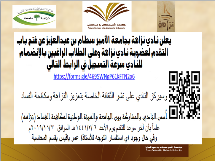 يدعوا نادي نزاهه التابعة لعمادة شؤون الطلاب بالجامعة الطلاب الراغبين في التسجيل بعضوية النادي والإستفادة من الفعاليات والأنشطة التي سيتم إقامتها من قبل النادي بشكل خاص او بالمشاركة مع الهيئة الوطنية لمكافحة الفساد خلال هذا العام الجامعي إلى التسجيل عن الطريق الرابط التالي:
