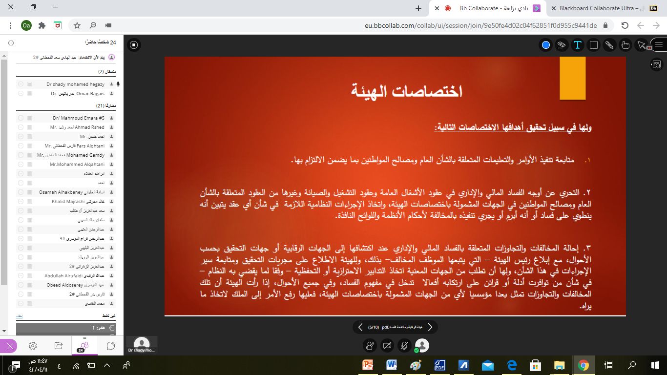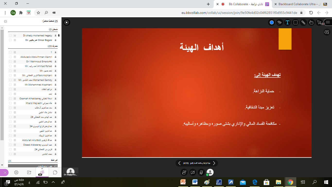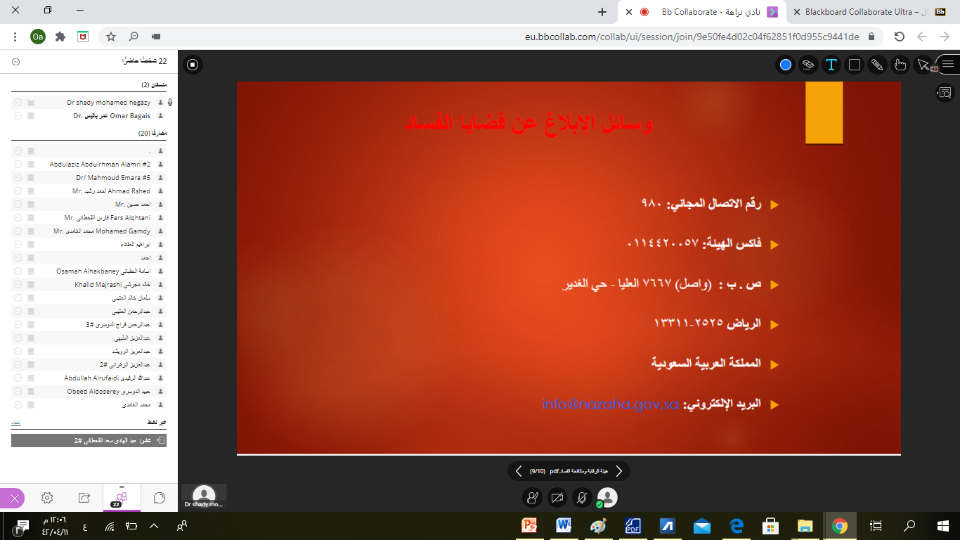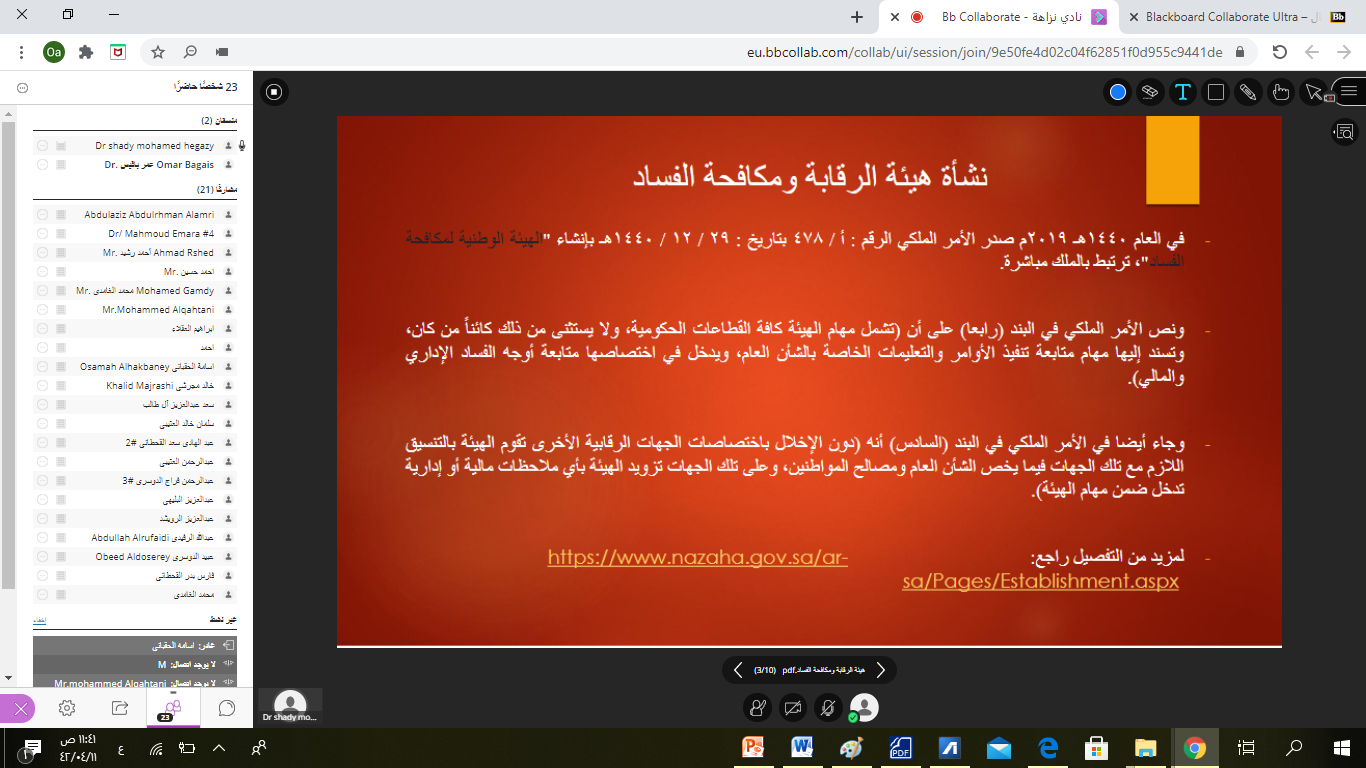 نظم نادي نزاهة التابع لعمادة شؤون الطلاب بكلية إدارة الأعمال اليوم الخميس 11/4/1442 هـ الموافق 27/11/2020 م محاضرة تعريفية عن هيئة الرقابة ومكافحة الفساد (النشأة- الأهداف- الاختصاصات- وسائل الإبلاغ), قدمها سعادة الدكتور شادي محمد حجازي الأستاذ المساعد بقسم القانون بكلية إدارة الأعمال والذي ركز فيها على إبراز جهود المملكة العربية السعودية في مكافحة الفساد ، مع توضيحه لأهداف واختصاصات الهيئة ، كما أشار سعادته أيضاً إلى بيان مفهوم الفساد بشكل عام والفساد المالي والإداري بشكل خاص، وتناول أيضاً الأنظمة السعودية الهامة في مكافحة الفساد وآلية تفعيلها في مكافحة الفساد، وقد شدد مقدم المحاضرة بأن الرقابة على النفس من أهم سبل تعزيز النزاهة لدى الفرد والتي ستنعكس على المجتمع, وأختتم الدكتور حجازي المحاضرة بإشادته بالجهود الحالية للهيئة ودورها في تثقيف المجتمع واستخدامها لكل الوسائل المتاحة والتي من ضمنها مواقع التواصل العامة وتعريف المجتمع بالآثار الناتجة عن الفساد في المجتمع.