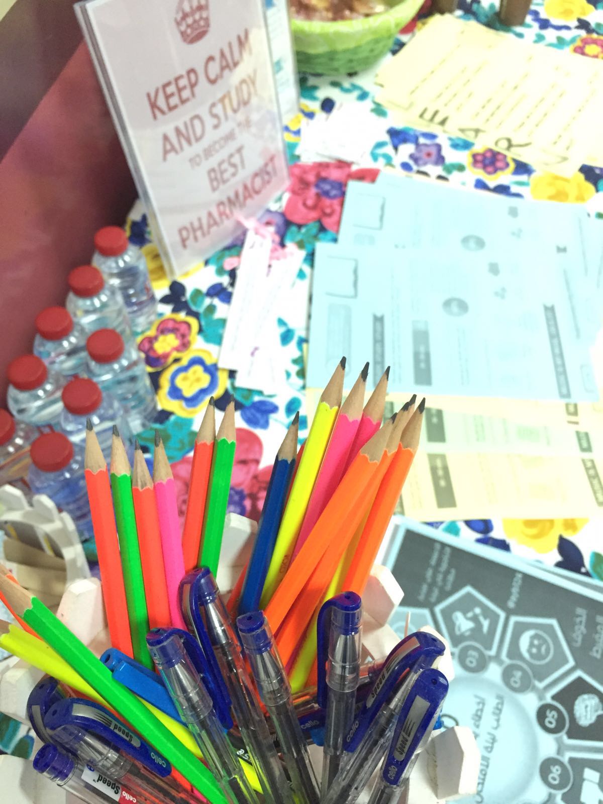 قام نادي صديقات الكلية بالصيدلة بتنفيذ ركن توعوي بهدف إزالة التوتر والاضطراب وتشتيت الأفكار الذي يصاحب الإمتحانات خاصة مع بدأ الإمتحانات الشهرية للطالبات حيث اشتمل الركن على مطويات ونشرات عن كيفية التعامل مع الإمتحانات ، وكيف تجتاز الطالبة هذه الأيام بهدوء وصفاء وأمان،. والإشارة إلى أهمية الاستعانة بالله والإقبال عليه فبيده وحده التوفيق والنجاح وبذل المجهود في المذاكرة ثم الرضا بقضاء الله تعالى وأن الإمتحانات ليست شبحًا كما يتصور البعض نواجهه بالمعارك, وإنما لابد من الاستيعاب القائم على الفهم وحفظ ما يمكن حفظه من قوانين وقواعد وأسس بالإضافة إلى أهمية إزالة النفور لدى بعض الطالبات , الذي قد يكون من طبيعة المادة, أو ممن يعرض المادة, أو من الصاحبات والشلة, و تهيئة جو صحي ممثل في ذهن صاف ليتم الفهم, والالتزام في الوقت ليتم الإلمام, والمذاكرة ليتم الاستيعاب, كما تم عرض الكثير من الحلول العملية للتعامل مع أيام الامتحانات بنماذج خاصة أعدت خصيصاً لهذا الغرض.