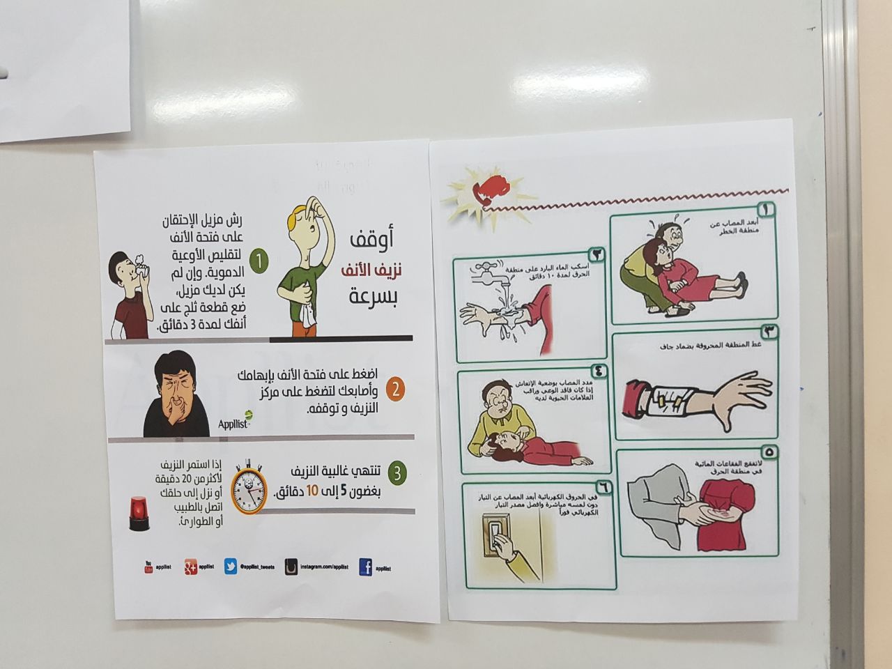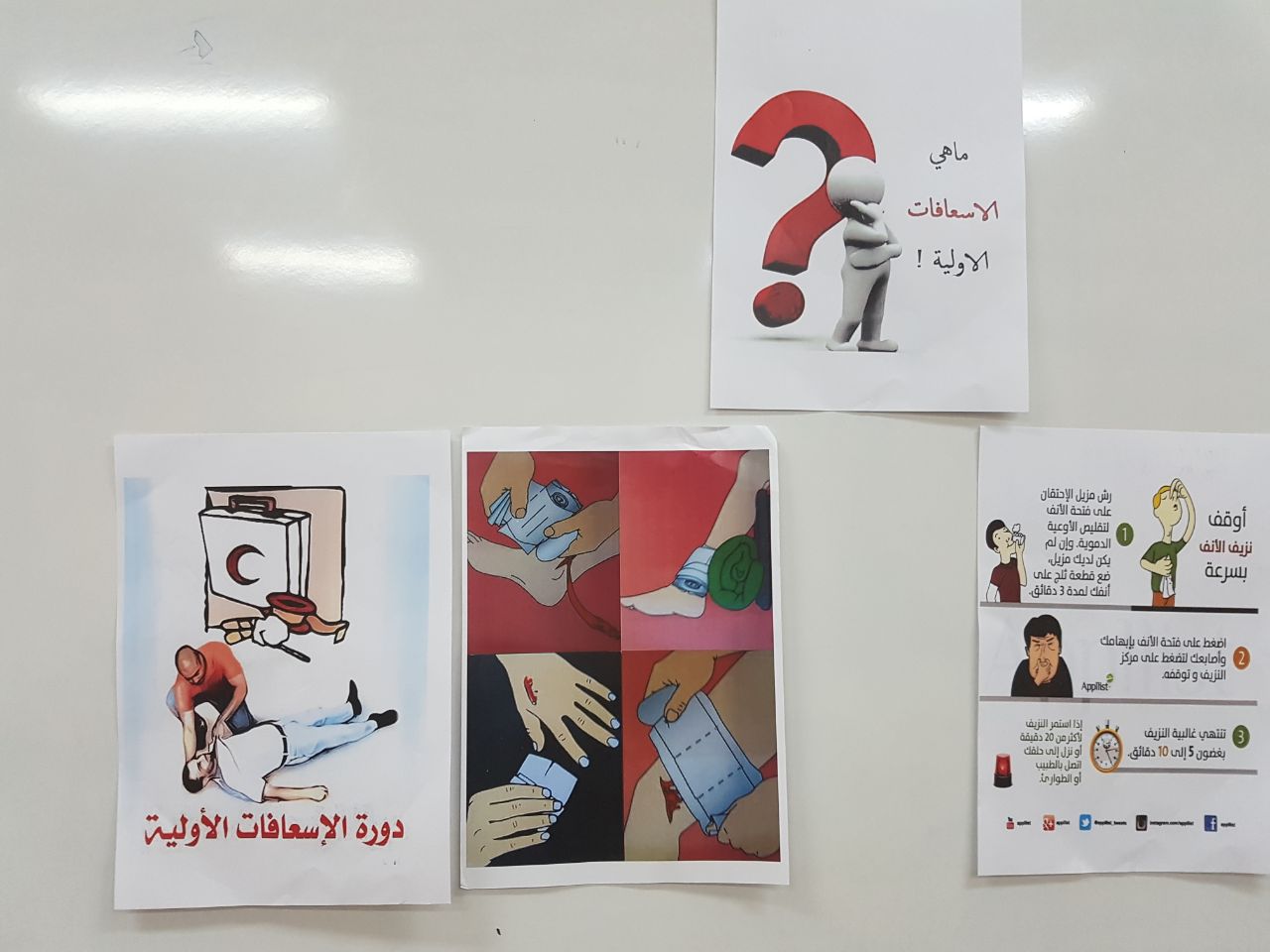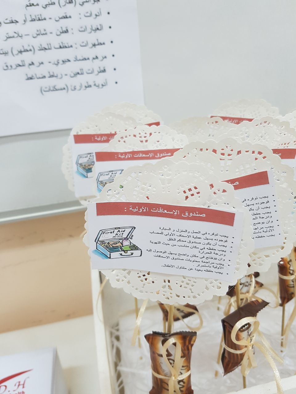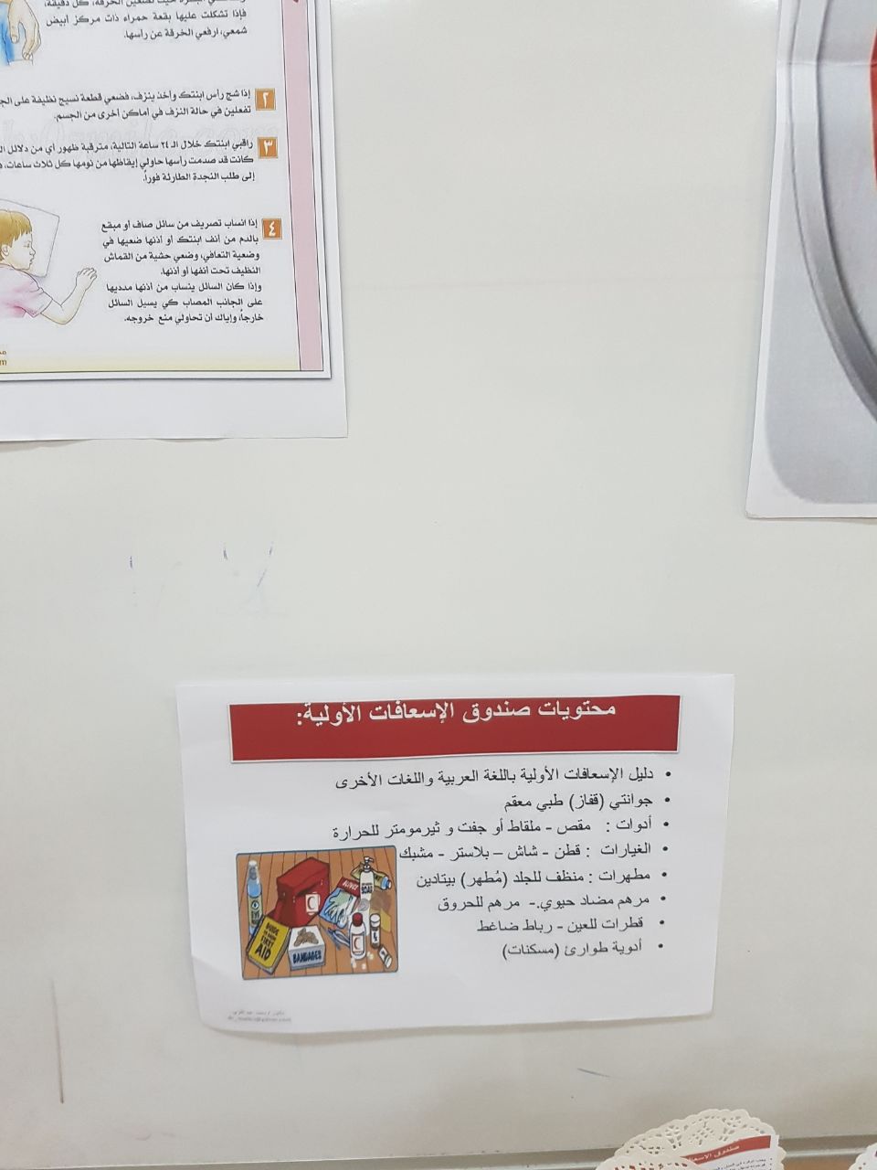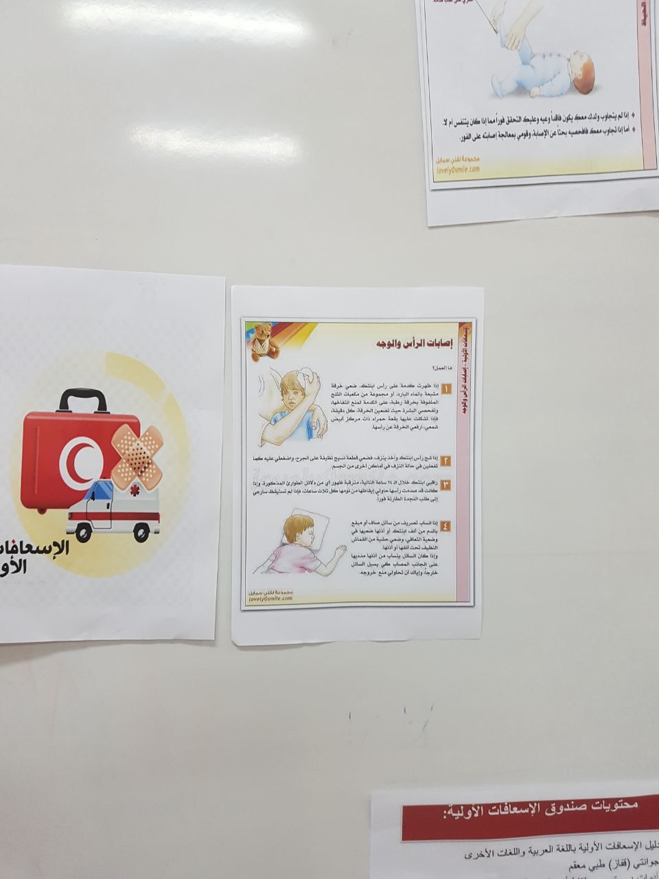 وقد تم عمل ركن خاص وتم فيه توضيح كيفية التعامل مع فقدان الوعي ووضع الإفاقة وطريقة التصرف السليمة مع حرائق المنزل لا قدر الله ونوبات دوار مرض السكري.