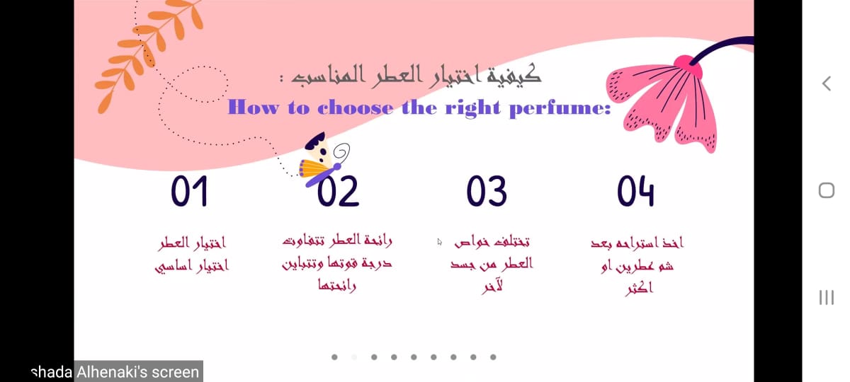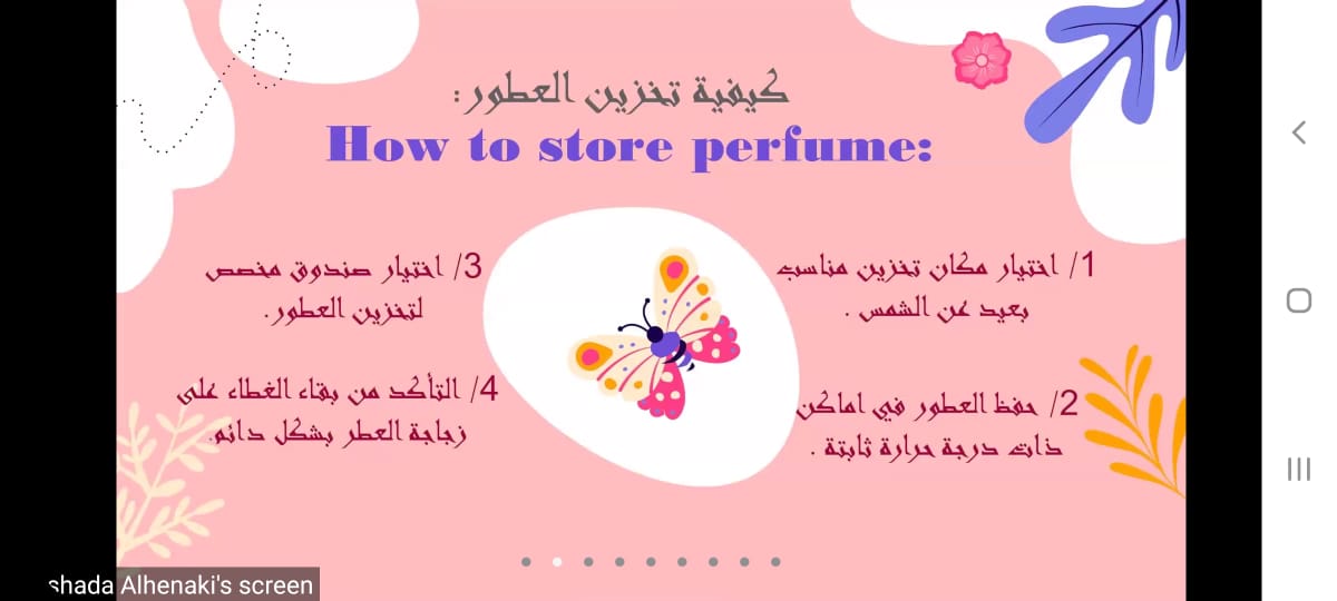 الأريج يطلق على كل رائحة عطرية طيبة فواحة وما لها من أثر طيب على النفس فهي تعطي الروح السكينة والهدوء، ولزيادة المعرفة بها وكيفية صناعتها، أقام نادي عون التطوعي بعمادة السنة التحضيرية -قسم الطالبات فعالية بعنوان (الأريج) وذلك يوم الثلاثاء الموافق 17/ 8 /1442هـ من خلال منصة برنامج zoom. فلقد تضمنت الفعالية نبذة تاريخية عن العطور ومعنى كلمة الأريج فهي نفحة الريح الطيبة ولما للعطور وأريجها الفواح من أثر طيب على النفس فلقد تم القاء الضوء على أثرها النفسي وتعديل المزاج العام للإنسان، كم تم استعراض كيفية تصنيعها وانتاجها وطرق اختيار العطور المناسبة و كيفية استخدامها، كما تم تناول أنواع العطور فمنها الطبيعي والصناعي و طريقة تصنيعها يدويا بالمنزل.