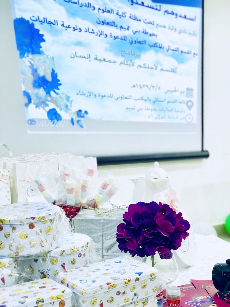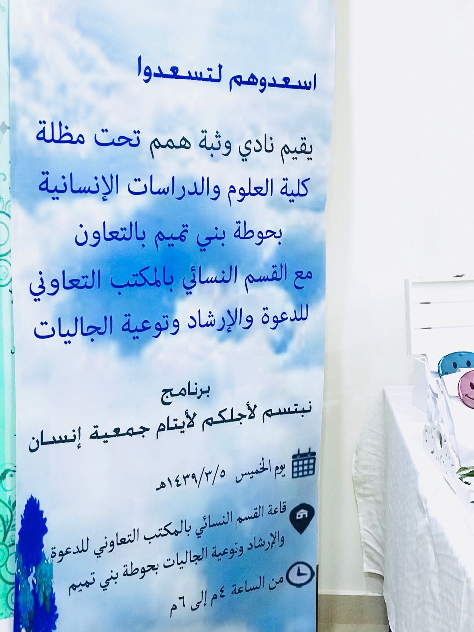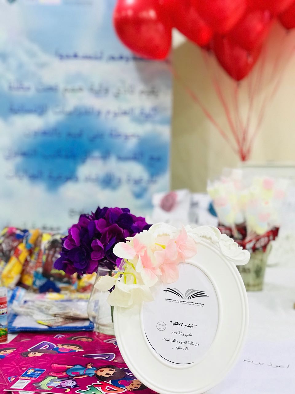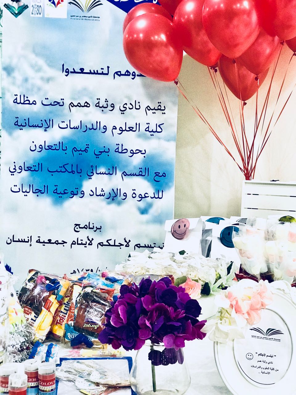 أقام نادي وثبة همم تحت مظلة كلية العلوم والدراسات الإنسانية وبالتعاون مع المكتب التعاوني للدعوة والارشاد وتوعية الجاليات القسم النسائي برنامج بعنوان نبتسم لأجلكم لأيتام جمعية إنسان وذلك يوم الخميس الموافق 5/ 3 / 1439هـ . أقيم البرنامج في تمام الساعة ٤:٠٠ مساء في قاعة المكتب وانطلق البرنامج بتقديم الطالبة بشاير المهنا ورحبت بالجميع وبدأت بالمسابقات للأطفال وتقسيمهم لفريقين وانضمت إليها الطالبة سارة العويرضي لعرض بعض الالعاب وقام بعض الطالبات بوضع المكياج وتسريح شعر الأطفال واقامت مسابقة أفضل طفلة جميلة وتم توزيع الهدايا لجميع الأطفال والقت مديرة المكتب النسائي أ.فوزية الجمعة كلمتها لشكر طالبات النادي والترحيب بعضوات جمعية إنسان وأمهات الاطفال. كما القت عضوة جمعية إنسان كلمتها وعبرت عن مشاعر الفرح بما تم تقديمه من طالبات النادي وعرضت بعض المهام المتواجدة لديهم وتوزيع بعض المنشورات وفي الختام القت أ. منى بن نويشر مشرفة نادي وثبة همم كلمتها بالشكر والعرفان لإدارة المكتب التعاوني ولتعاونهم البناء واتاحة طالبات النادي بالمشاركة بهذا العمل التطوعي الجميل كما شكرت عضوات جمعية انسان لاهتمامهم وتواجدهم مع الاطفال والشكر الخاص لطالبات نادي وثبة همم لحماسهم وتفاعلهم وجهدهم الجبار وعطائهم سائلين المولى عزوجل ان يتقبل ماقدم من عمل.