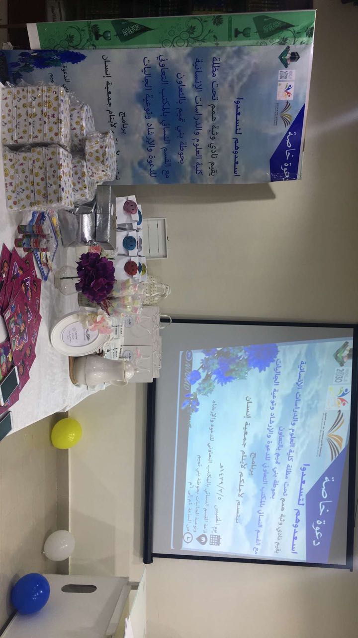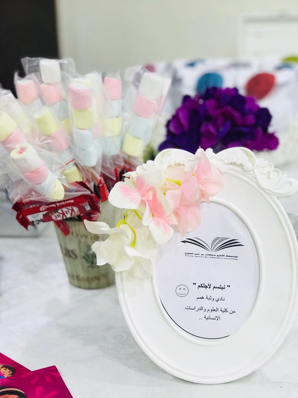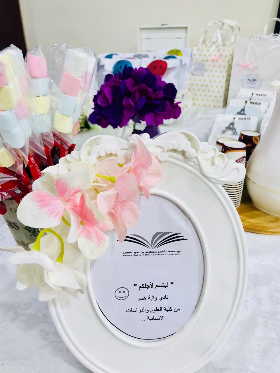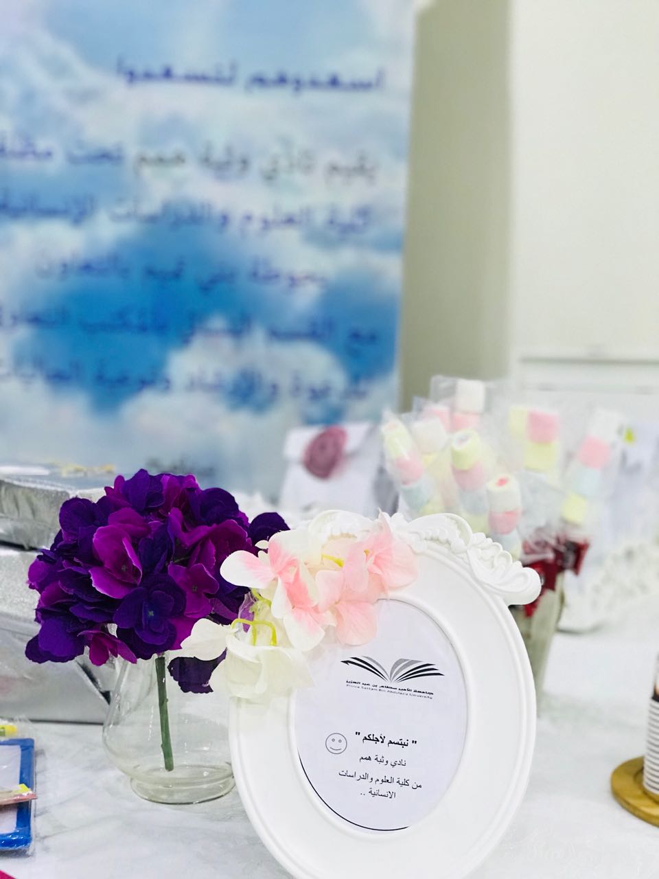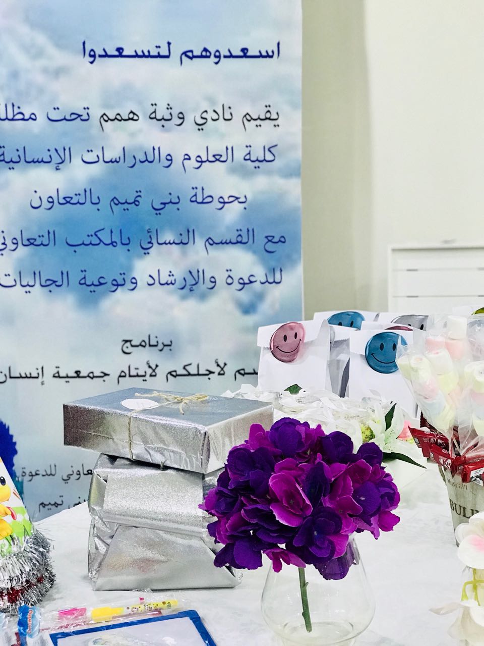 أقام نادي وثبة همم تحت مظلة كلية العلوم والدراسات الإنسانية وبالتعاون مع المكتب التعاوني للدعوة والارشاد وتوعية الجاليات القسم النسائي برنامج بعنوان نبتسم لأجلكم لأيتام جمعية إنسان وذلك يوم الخميس الموافق 5/ 3 / 1439هـ . أقيم البرنامج في تمام الساعة ٤:٠٠ مساء في قاعة المكتب وانطلق البرنامج بتقديم الطالبة بشاير المهنا ورحبت بالجميع وبدأت بالمسابقات للأطفال وتقسيمهم لفريقين وانضمت إليها الطالبة سارة العويرضي لعرض بعض الالعاب وقام بعض الطالبات بوضع المكياج وتسريح شعر الأطفال واقامت مسابقة أفضل طفلة جميلة وتم توزيع الهدايا لجميع الأطفال والقت مديرة المكتب النسائي أ.فوزية الجمعة كلمتها لشكر طالبات النادي والترحيب بعضوات جمعية إنسان وأمهات الاطفال. كما القت عضوة جمعية إنسان كلمتها وعبرت عن مشاعر الفرح بما تم تقديمه من طالبات النادي وعرضت بعض المهام المتواجدة لديهم وتوزيع بعض المنشورات وفي الختام القت أ. منى بن نويشر مشرفة نادي وثبة همم كلمتها بالشكر والعرفان لإدارة المكتب التعاوني ولتعاونهم البناء واتاحة طالبات النادي بالمشاركة بهذا العمل التطوعي الجميل كما شكرت عضوات جمعية انسان لاهتمامهم وتواجدهم مع الاطفال والشكر الخاص لطالبات نادي وثبة همم لحماسهم وتفاعلهم وجهدهم الجبار وعطائهم سائلين المولى عزوجل ان يتقبل ماقدم من عمل.