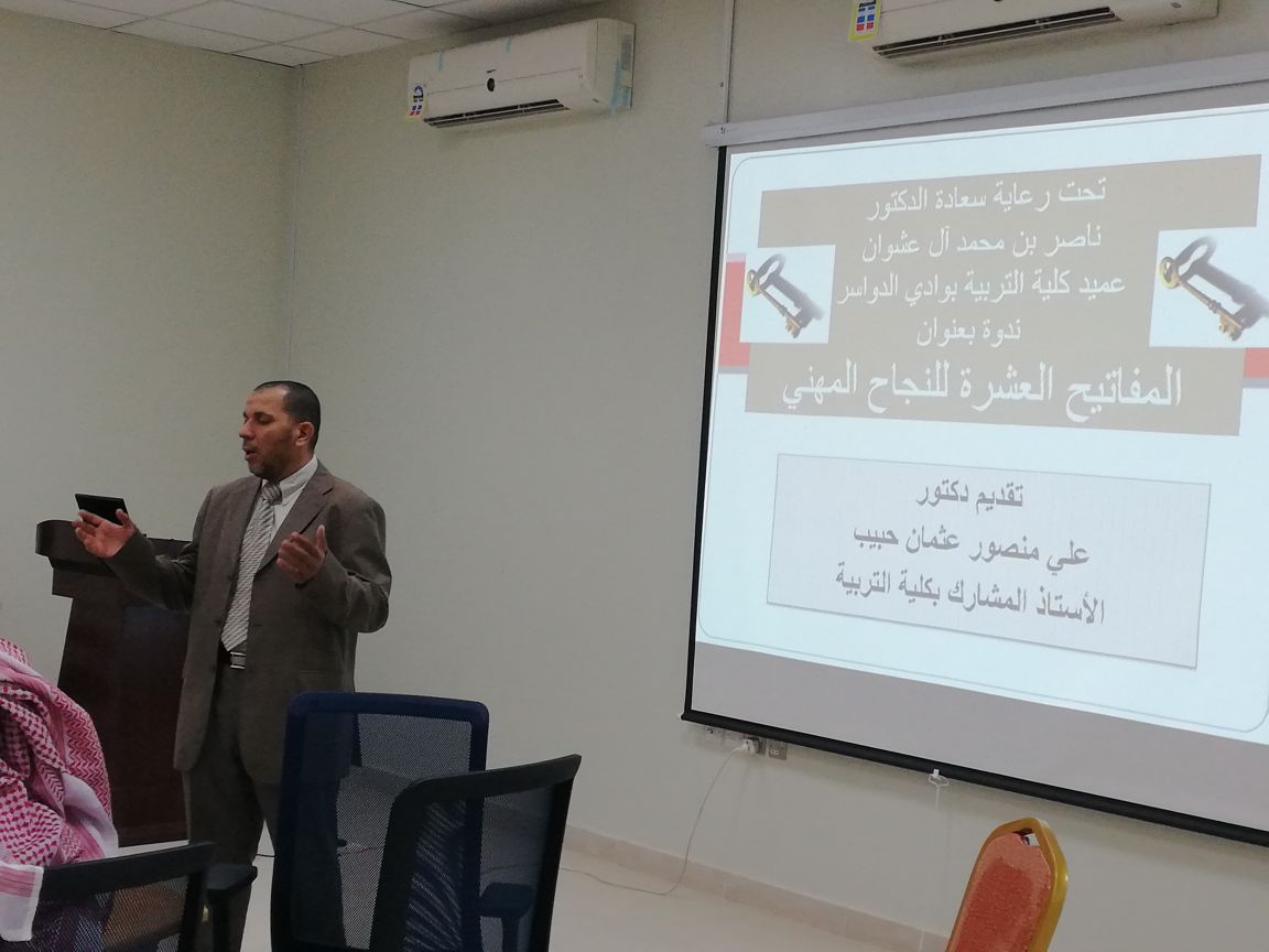 توجيهات ومتابعة د. ناصر بن محمد آل عشوان عميد كلية التربية بوادي الدواسر ، نظمت وحدة الخريجين (لجنة التأهيل والتدريب) ندوة بعنوان المفاتيح العشرة للنجاح المهني ، وذلك في قاعة التدريب بالكلية ، وقام بتقديم الندوة الدكتور/ علي منصور عثمان حبيب الأستاذ المشارك بقسم الدراسات الإسلامية بكلية التربية.