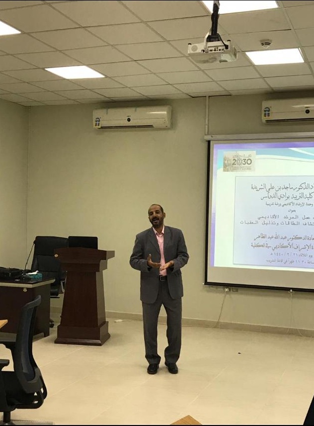 بحضور عدد من السادة أعضاء هيئة التدريس والطلاب أقامت كلية التربية بوادي الدواسر ممثلة بوحدة الإرشاد الأكاديمي ندوة بعنوان ( آليات عمل المرشد الأكاديمي خطوة نحو اكتشاف الطاقات وتذليل العثرات ) ، قدمها الدكتور / عبدالله الخولى أستاذ الصحة النفسية المشارك بقسم العلوم التربوية .