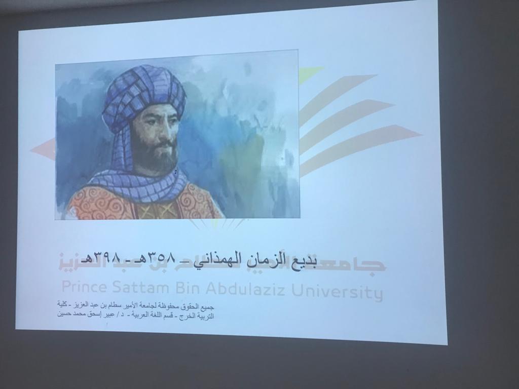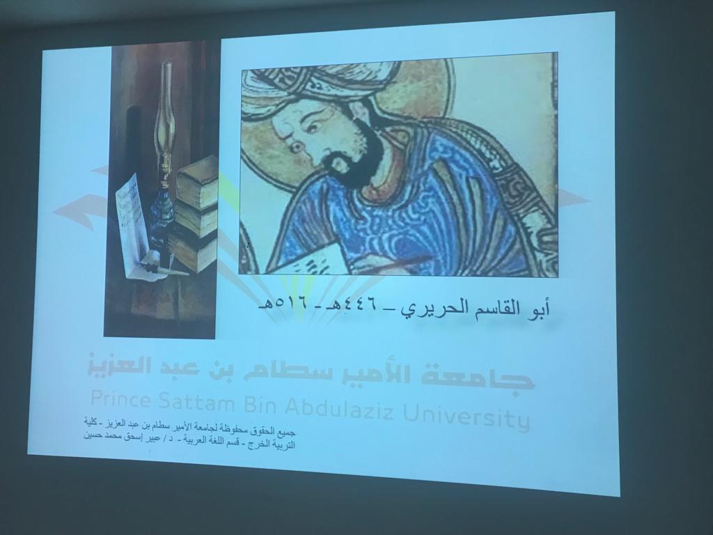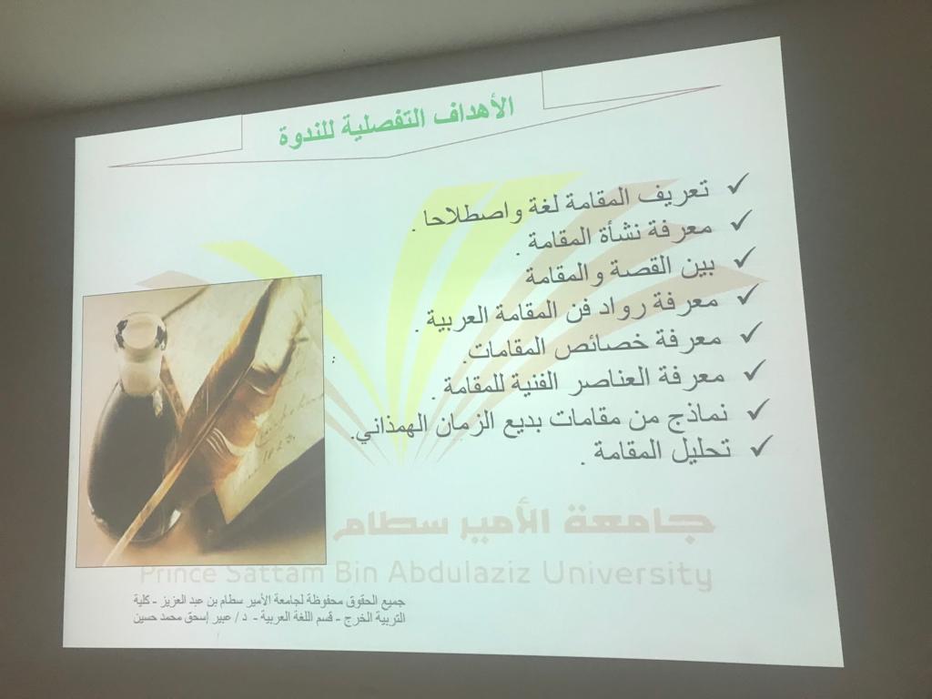 عقد النادي الأدبي المسرحي في كلية التربية بالخرج اليوم الأحد الموافق ٢٠-٣ – ١٤٤١هـ, ندوة بعنوان (فن المقامة).وكان من أهم أهدافها التعرف على فن المقامة نشأته وإعلامة ودوره في تنمية اللغة وصلته بالفنون السردية الحديثة ,ومعرفة خصائص المقامات والعناصر الفنية لها ٠وعرض لنماذج بعض العلماء وسيرهم الذاتية, ومعرفة كيفية التذوق الأدبي لهذا الفن .وقد لاقت حضوراً فعالاً من الطالبات.