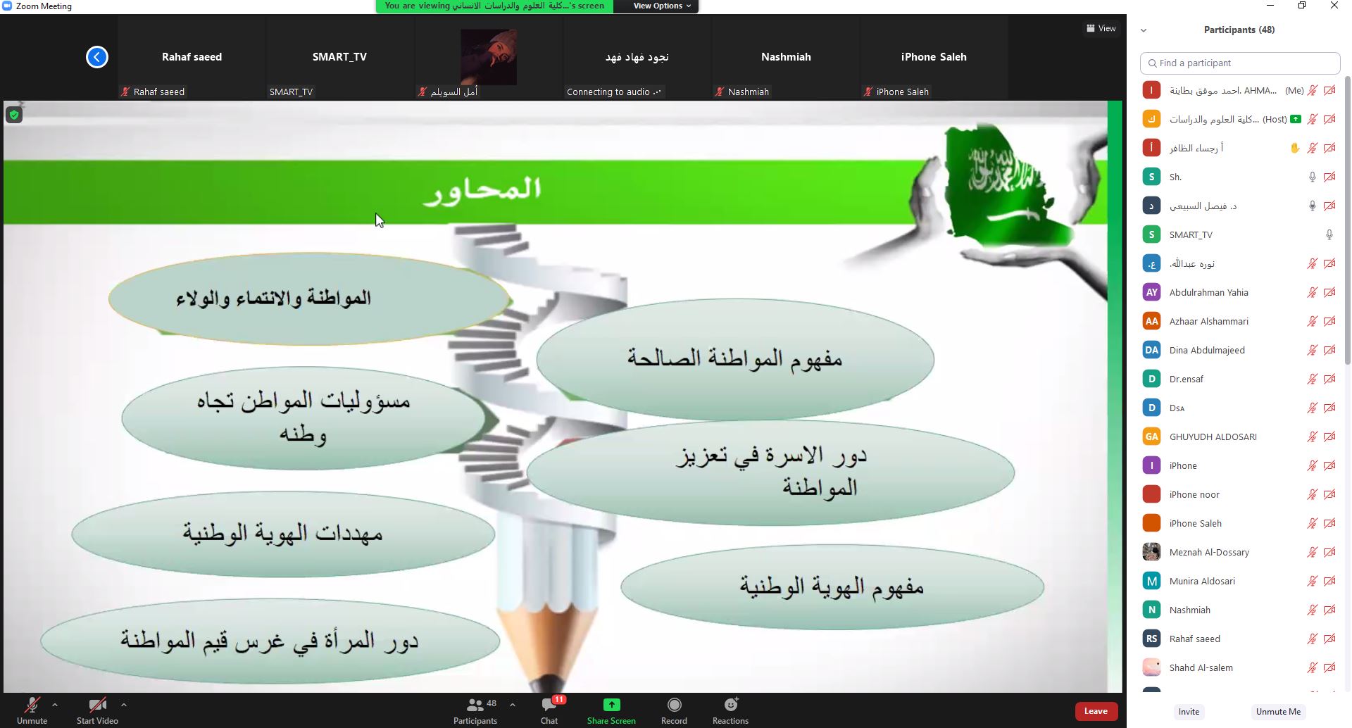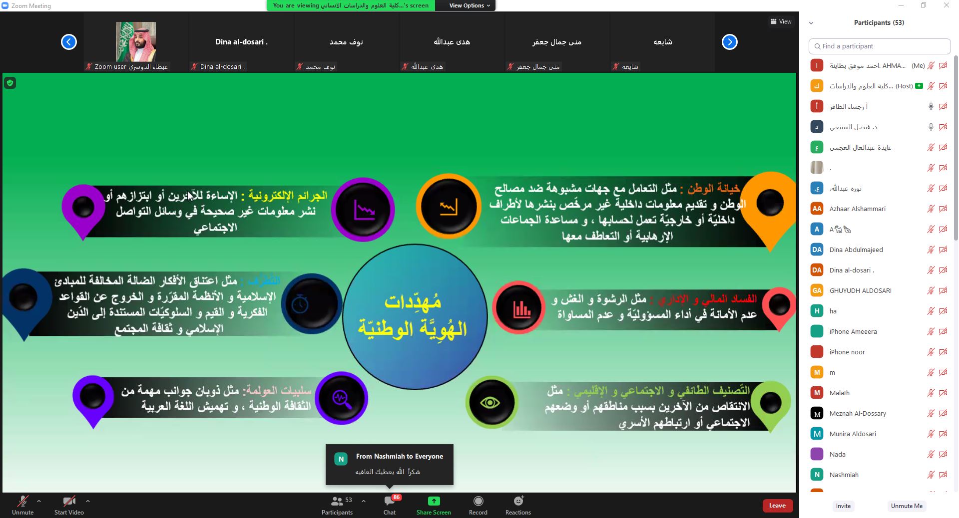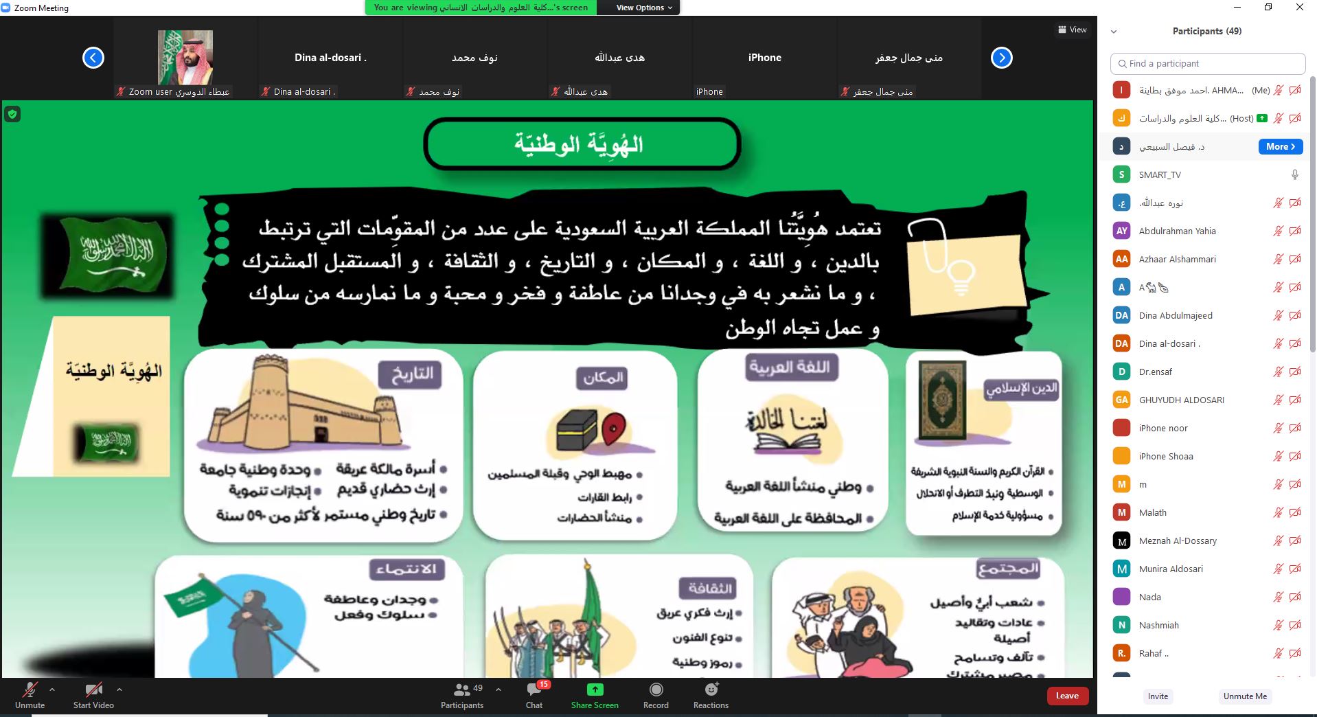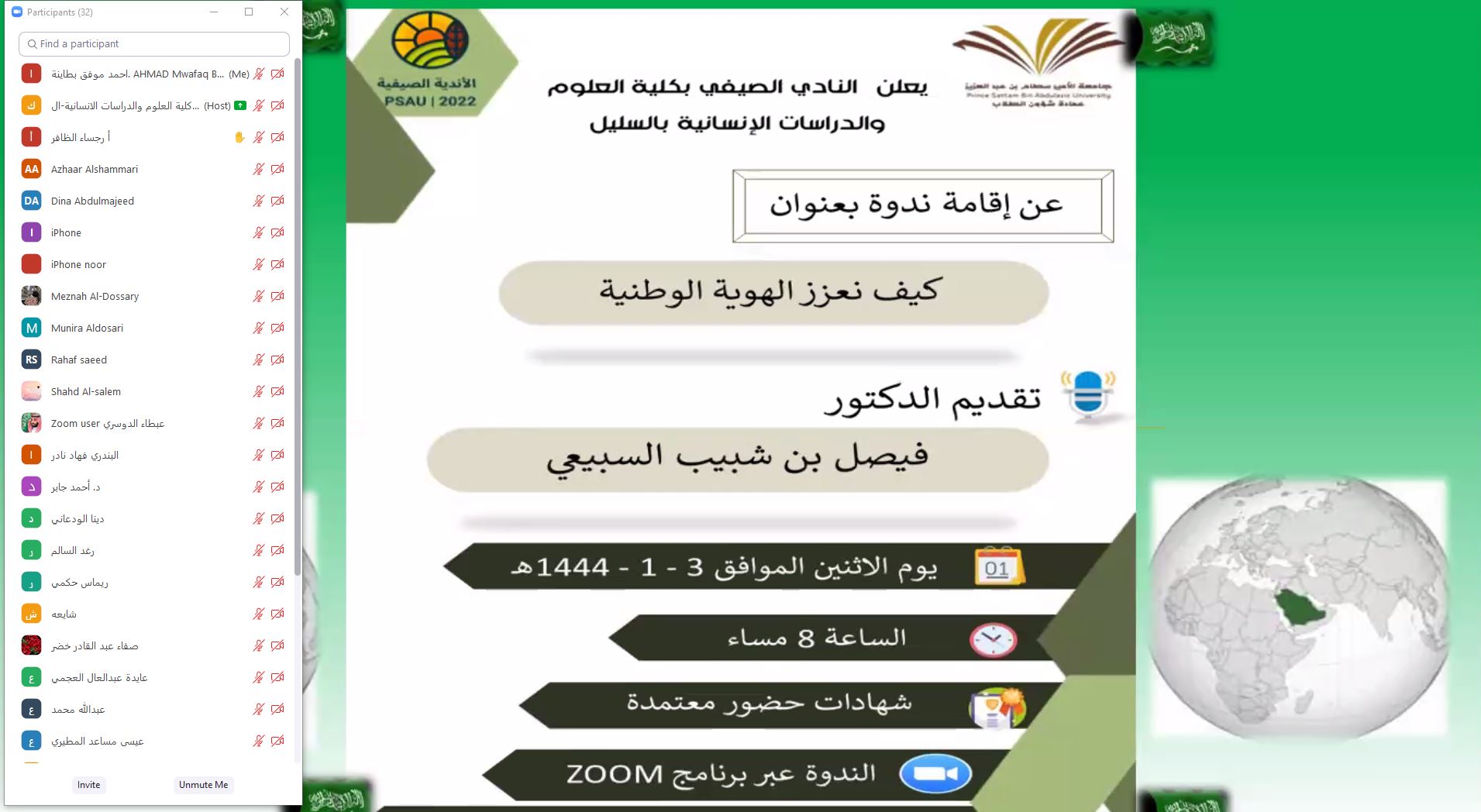 في إطار فعاليات النادي الصيفي بكلية العلوم والدراسات الإنسانية بالسليل قدم سعادة الدكتور فيصل بن شبيب السبيعي عميد الكلية ندوة بعنوان(( كيف نعزز الهوية الوطنية)) وذلك يوم الاثنين بتاريخ 3 /1 / 1444 هـ الموافق 1 /8 /2022 مــ و كانت موجهه لطلاب وطالبات الكلية وقد شارك اكثر من 60 مشارك في الندوة .