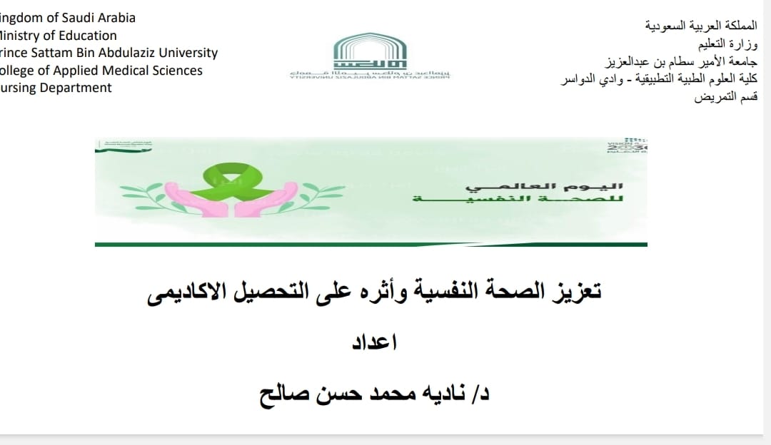 أقامت وحدة التوجيه والارشاد بكلية العلوم الطبية التطبيقية بوادى الدواسر تحت إشراف دكتورة ميرفت الكاشف بالتعاون مع وحدة التوجيه والارشاد بعمادة شؤون الطلاب بتفعيل اليوم العالمى للصحة النفسية ،