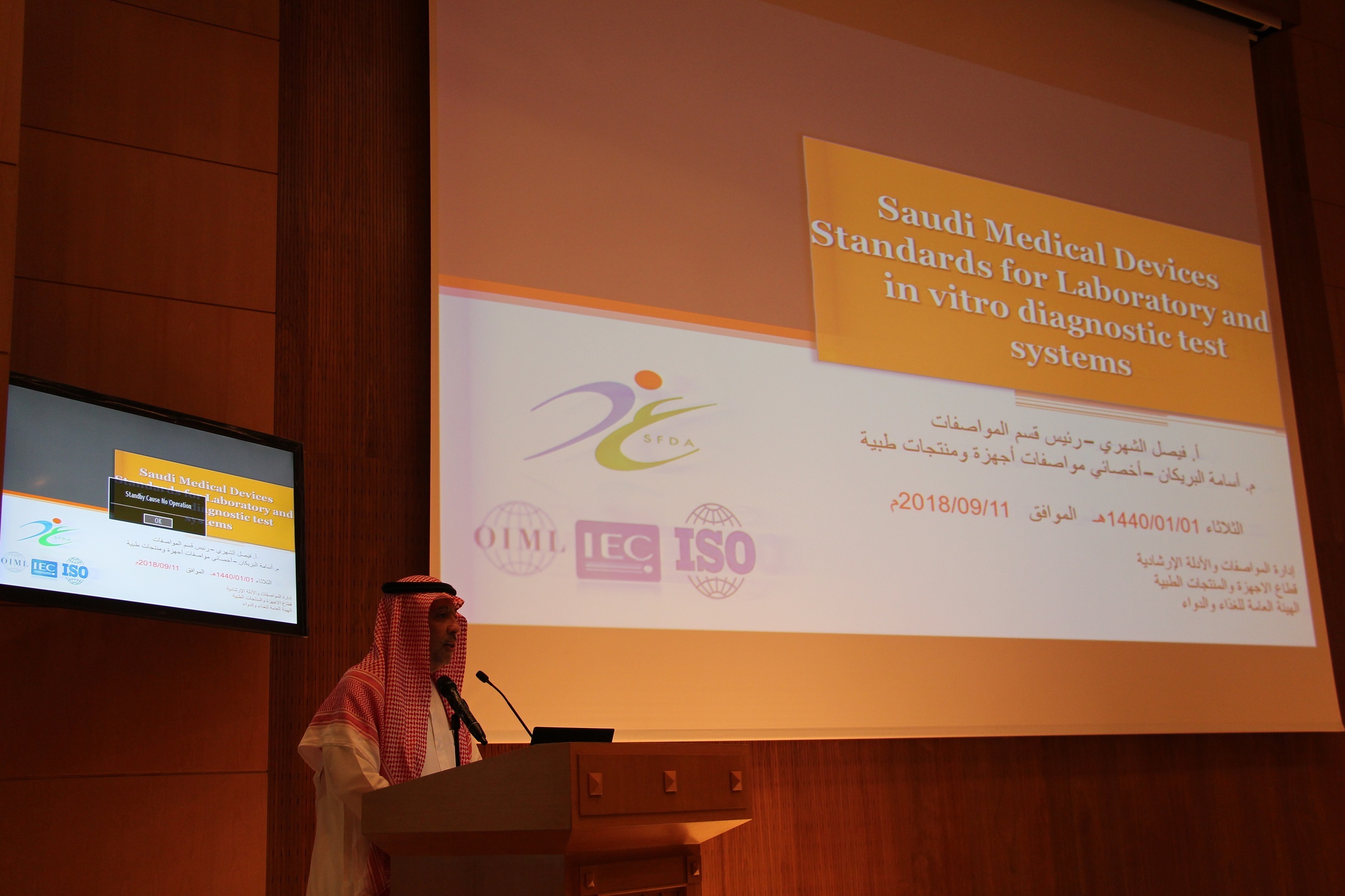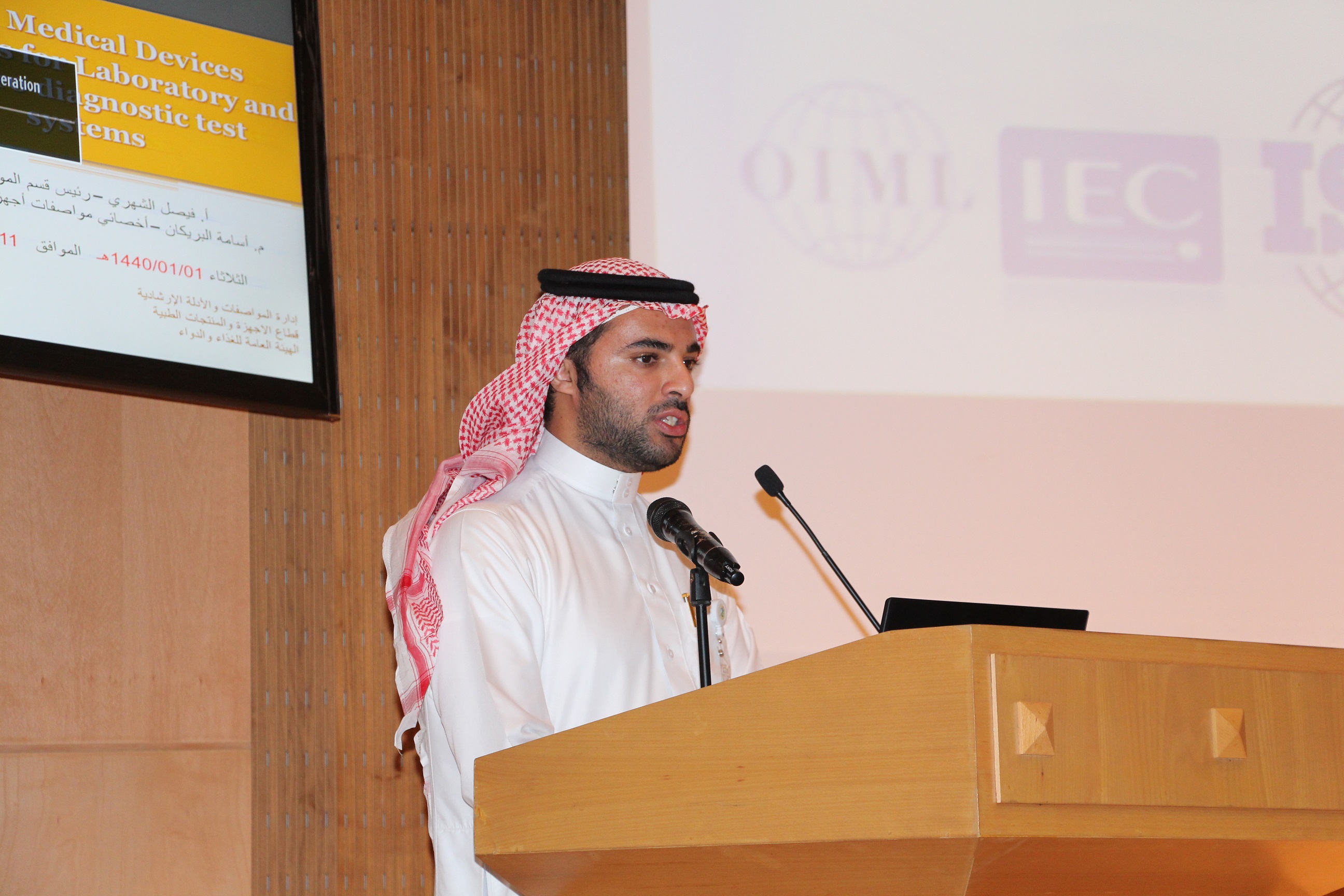 ثم تحدث الأستاذ فيصل الشهري عن العلاقات مع الجهات التخصصية في مجال المواصفات والمقاييس وما يخص الجوانب الطبية، كما أعطى فكرة عن مراحل وخطوات إعداد المواصفة والموافقة عليها وإقرارها.