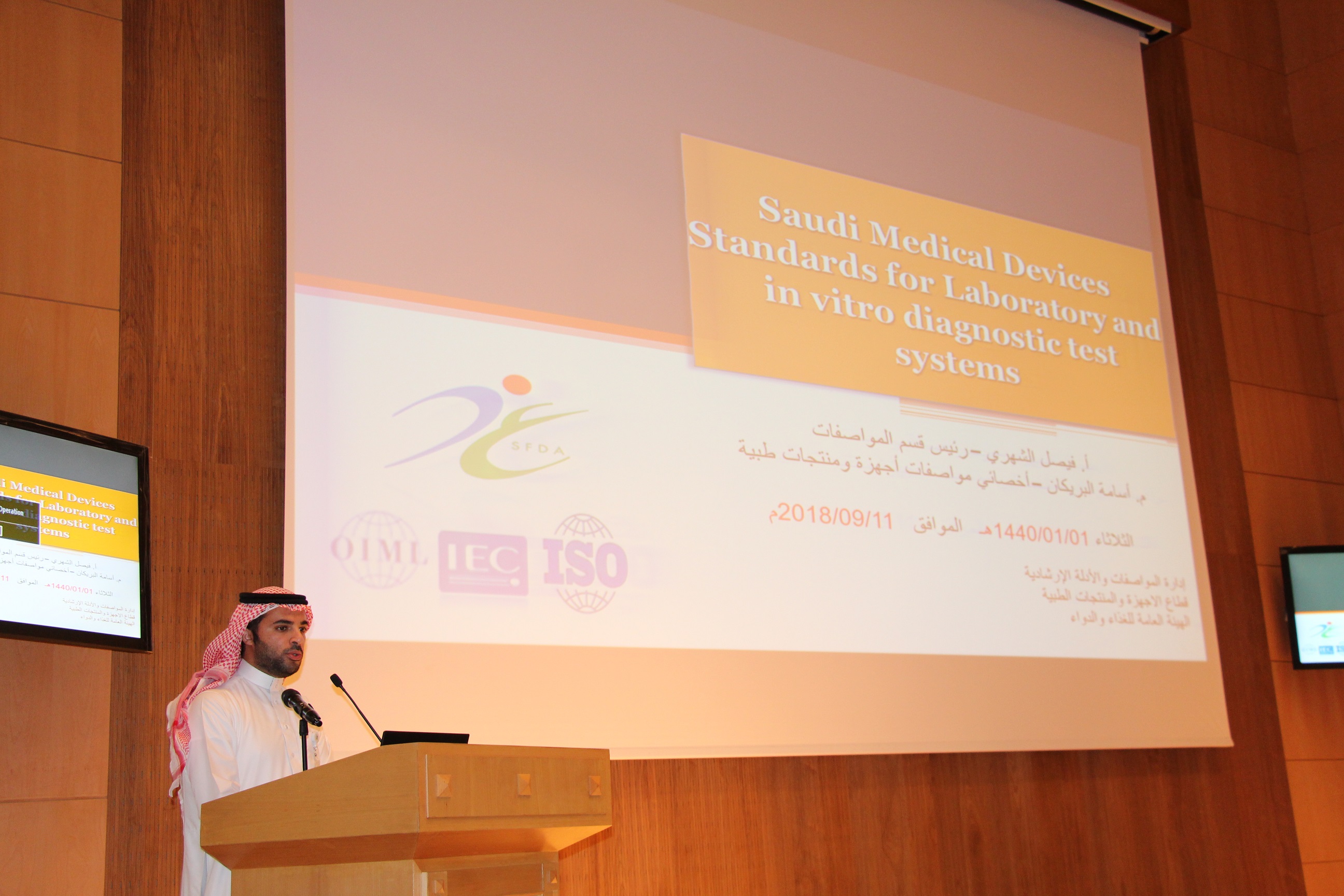 مزامنةً مع بداية العام الجامعي الجديد أقامت كلية العلوم الطبية التطبيقية بالخرج ندوة عن المواصفات السعودية في مجال الفحوصات السريرية وأجهزة الاختبار التشخيصي. ألقاها كل من الأستاذ فيصل بن علي الشهري، رئيس قسم المواصفات في الهيئة العامة للغذاء والدواء. والمهندس أسامة محمد البريكان، أخصائي مواصفات وأجهزة ومنتجات طبية في الهيئة العامة للغذاء والدواء.