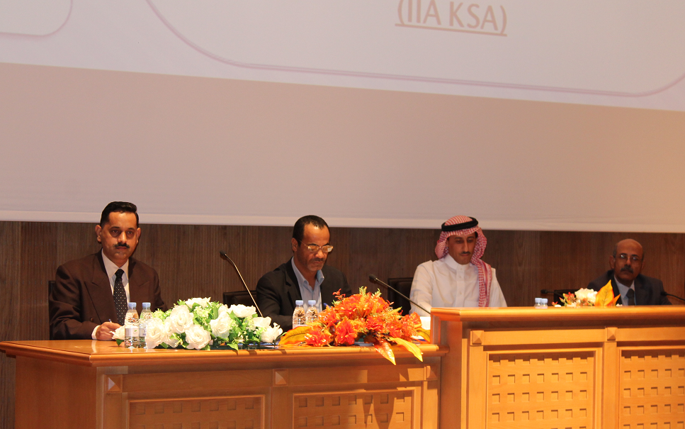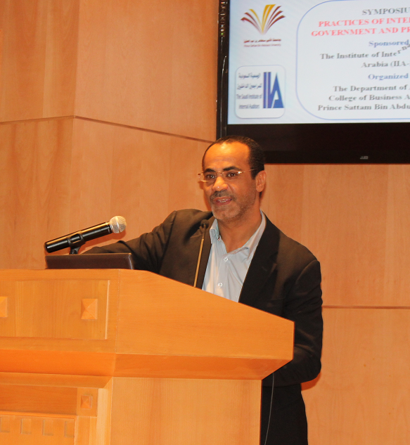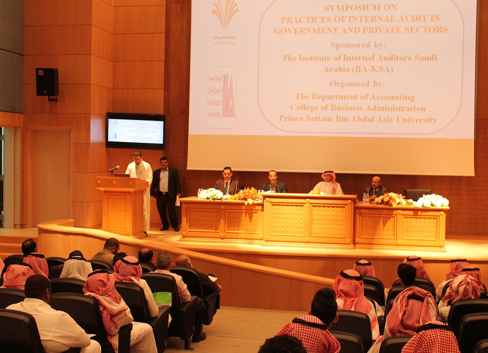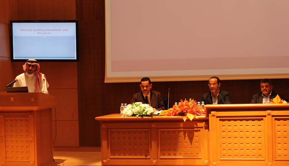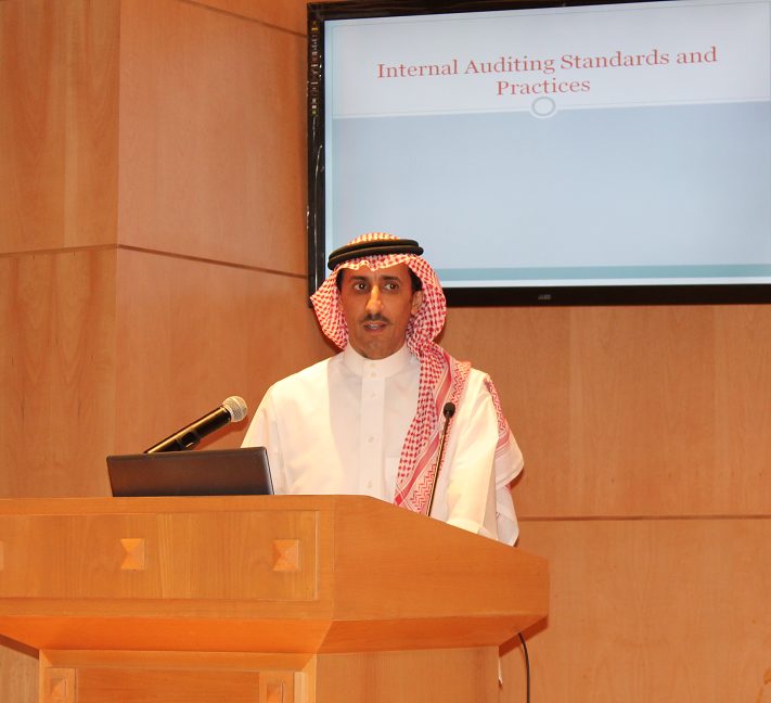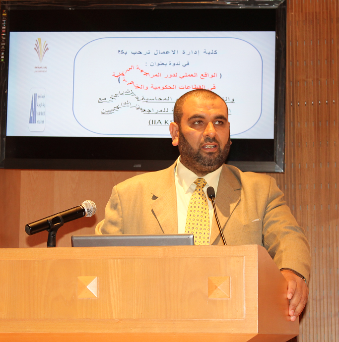 برعاية عميد الكلية الدكتور ناصر بن سعد القحطاني ، استضافت كلية إدارة الأعمال ممثلة ً في قسم المحاسبة ندوة بعنوان : " الواقع العملي لدور المراجعة الداخلية في القطاعات الحكومية والخاصة " تحدث فيها الأستاذ أسامة الحديثي ، كبير مستشاري مجلس هيئة السوق المالية والعضو التنفيذي في مجلس إدارة الجمعية السعودية للمراجعين الداخليين ، حيث تخللت الندوة كلمة للدكتور علاء محمد ملو العين ، المشرف على قسم المحاسبة ، و الدكتور طارق توفيق الخطيب ، رئيس لجنة الأنشطة الطلابية ، وتقديم مميز من الدكتور نبيل أحمد سنان ، وتناولت الندوة واقع المراجعة الداخلية في القطاعين الحكومي والخاص بالإضافة إلى تعريف المراجعة الداخلية وتوضيح عوامل تطورها وإطارها الفكري ووظائفها، وشروط فعاليتها ودور لجان المراجعة، وطرق تدعيم وظيفة المراجعة والعمل على صيانتها ورفع مستوى وجودة أدائها ودور المراجعة الداخلية في حماية الأصول ومكافحة الفساد ومهام وحدود وطبيعة وظيفة المراجعة الداخلية في المنشأة وأهم معاييرها والمتطلبات الأساسية الواجب توافرها لوجود نظام فعال للمراجعة الداخلية والتحديات والصعوبات التي تواجه إداراتها في القطاع الخاص والقطاع الحكومي ومفهوم الحوكمة وأهميتها في المراجعة الداخلية . وتأتي الندوة في إطار شراكة قسم المحاسبة مع المجتمع الخارجي وخاصة الجهات ذات العلاقة بمهنة ودور المحاسبة والتي على رأسها الهيئة السعودية للمحاسبين القانونيين SOCPA و الجمعية السعودية للمراجعين الداخليين IIA KSA .