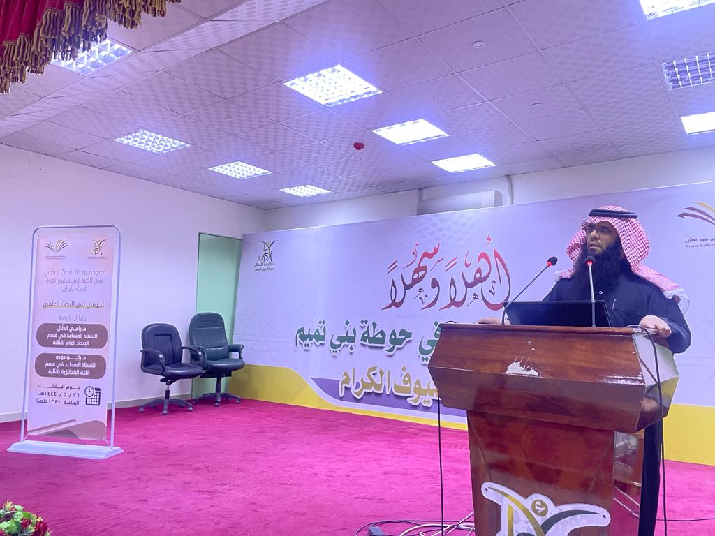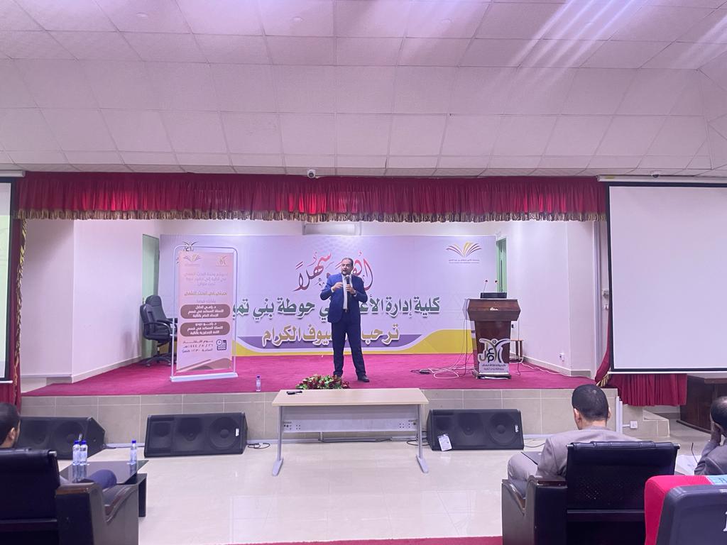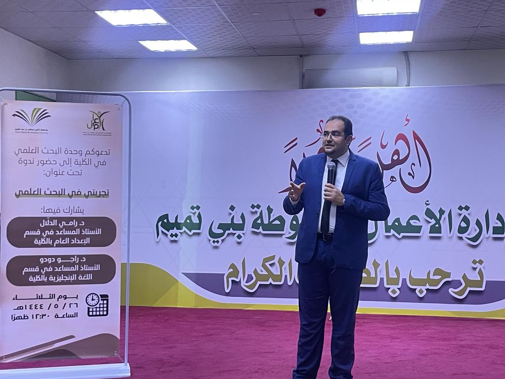 نظمت كلية إدارة الأعمال في حوطة بني تميم ممثلة بوحدة البحث العلمي ندوة تحت عنوان: (تجربتي في البحث العلمي)، شارك فيها د. رامي الدلّال الأستاذ المساعد في قسم المحاسبة، ود. راجو دودو الأستاذ المساعد في قسم اللغة الإنجليزية، يوم الثلاثاء ١٤٤٤/٥/٢٦هـ.