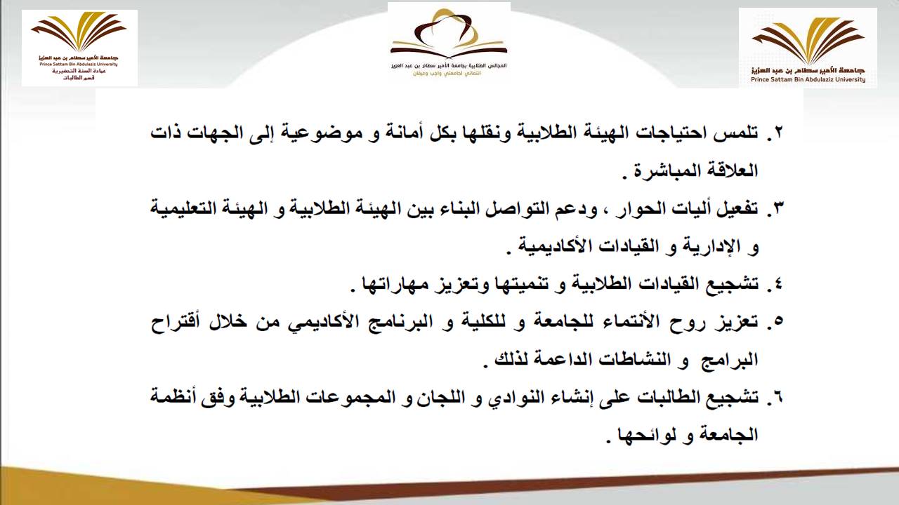 وركزت الندوة على التعريف بالمجلس الطلابي ومهامه وأهدافه ، والتي من أهمها تلمس مشكلات الطالبات واحتياجاتهن ومن ثم مناقشتها مع الجهات ذات العلاقة ، وتوضيح آلية الترشح للمجلس الطلابي وذلك بتعبئة النموذج الالكتروني الخاص ومناقشة آلية التصويت الإلكتروني وكيفية فرز الأصوات التي ستتم بطريقة إلكترونية في الأسابيع القادمة.
