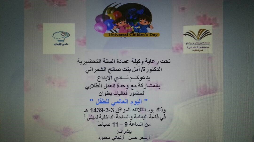نظمت وحدة العمل الطلابي يوم الثلاثاء الموافق 3/3/1439هـ وبمشاركة مشروع طفلك مسؤوليتك، ندوة بعنوان "يوم الطفل العالمي " بعمادة السنة التحضيرية شطر الطالبات وتم افتتاح الفعاليات من وكيلة العمادة الدكتورة/ أمل الشمراني بقاعة اليمامة وبحضور العديد من منسوبات العمادة وطالباتها.