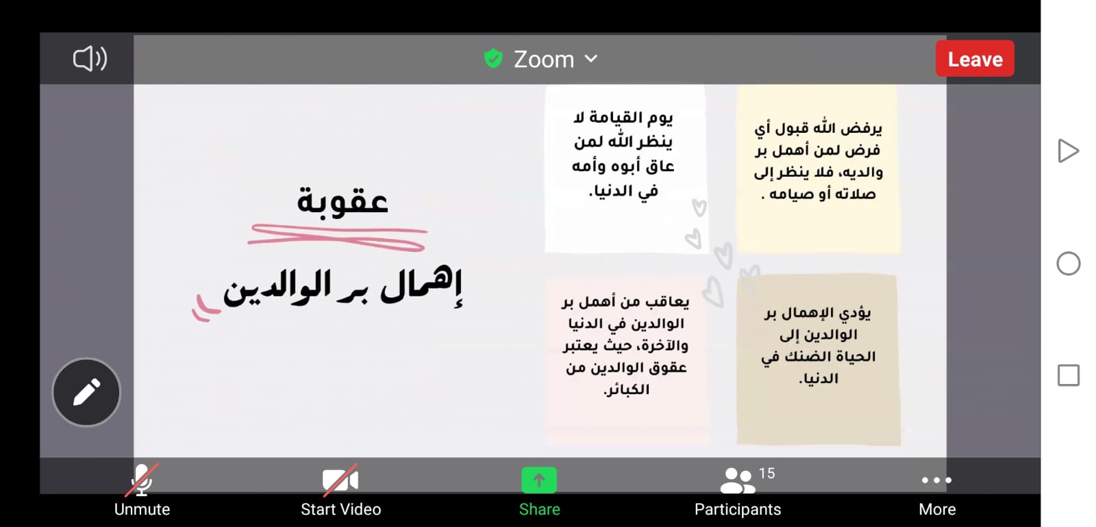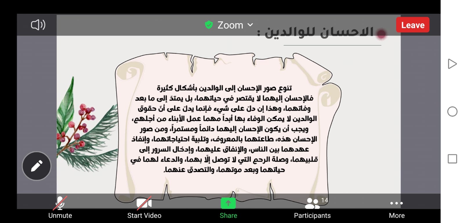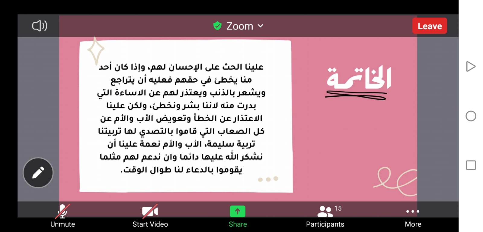 " يوم الأربعاء1443/2/29هـ الموافق 2021/10/6م - الساعة 8 م، وذلك بإشراف أ. زهراء علي عبد الله، وبحضور منسوبات العمادة وطالباتها. عرضن الطالبات فضل بر الوالدين والإحسان إليهما وحقوقهما علينا، وتحدثن عن صور وأشكال البر في حياتهما وما يكون بعد وفاتهما وهدفت هذه الفعالية الى: إن الإحسان إلى الوالدين واجب مفروض على كل شخص لأنهم السبب في وجوده في هذه الحياة بأمر من الله.