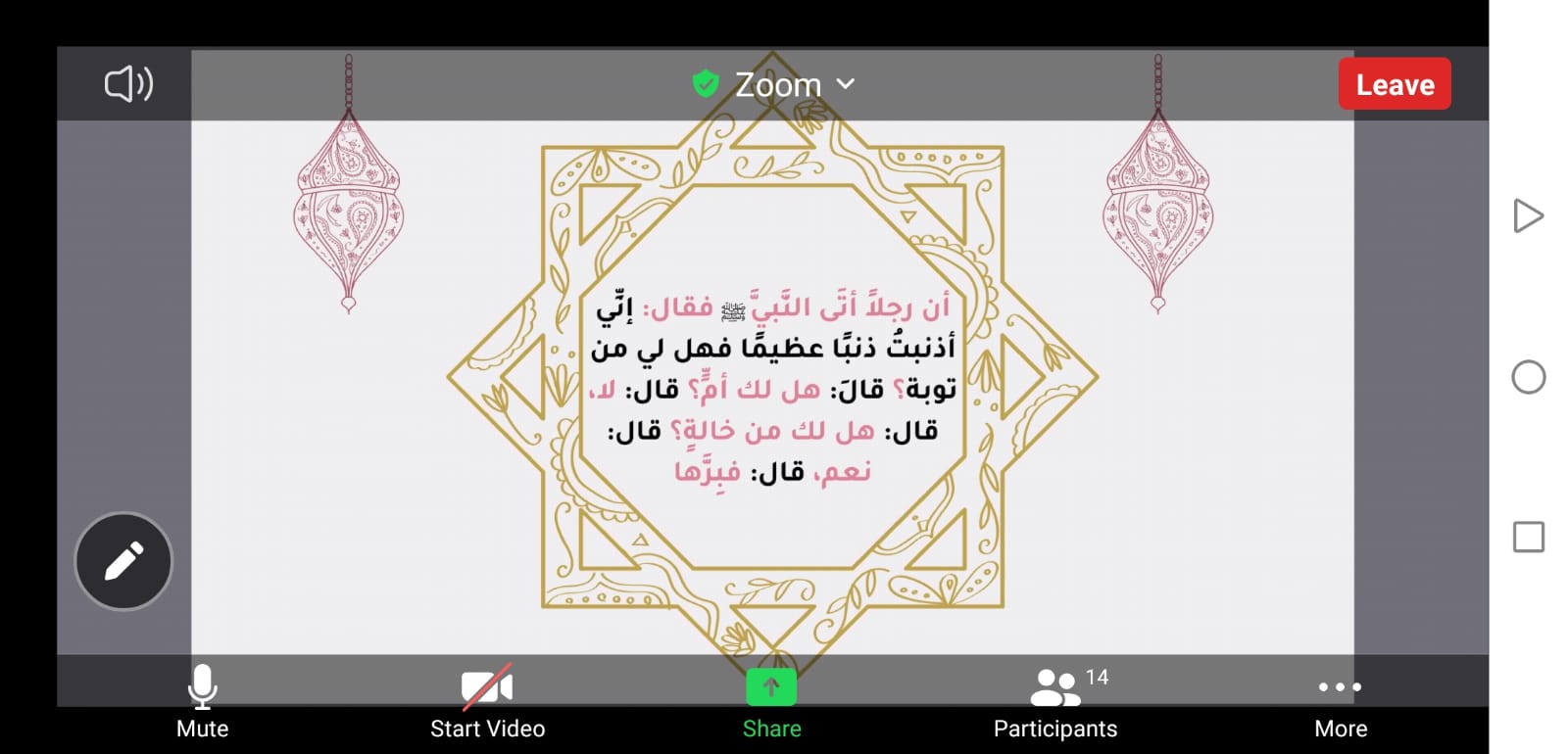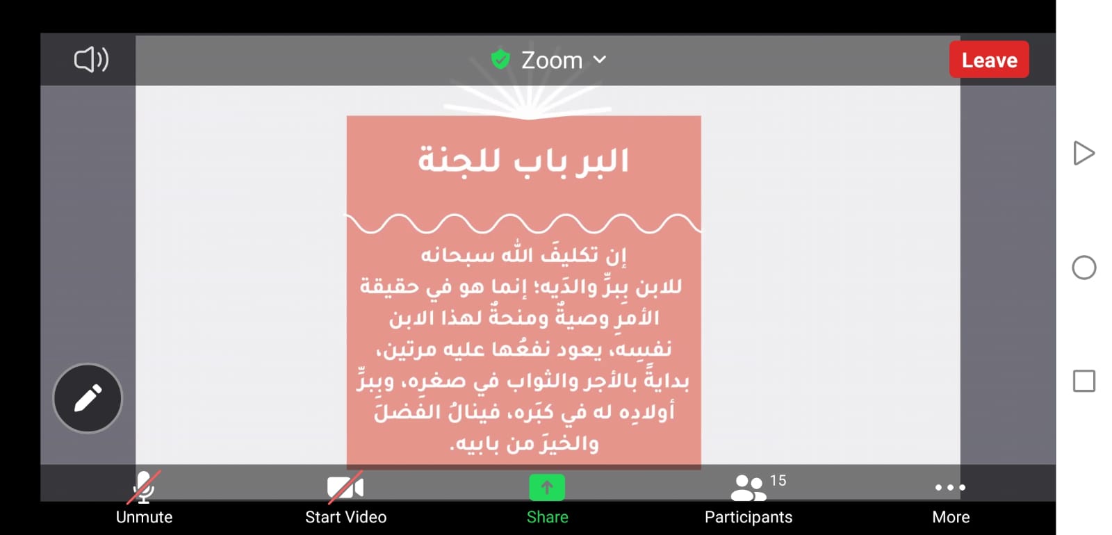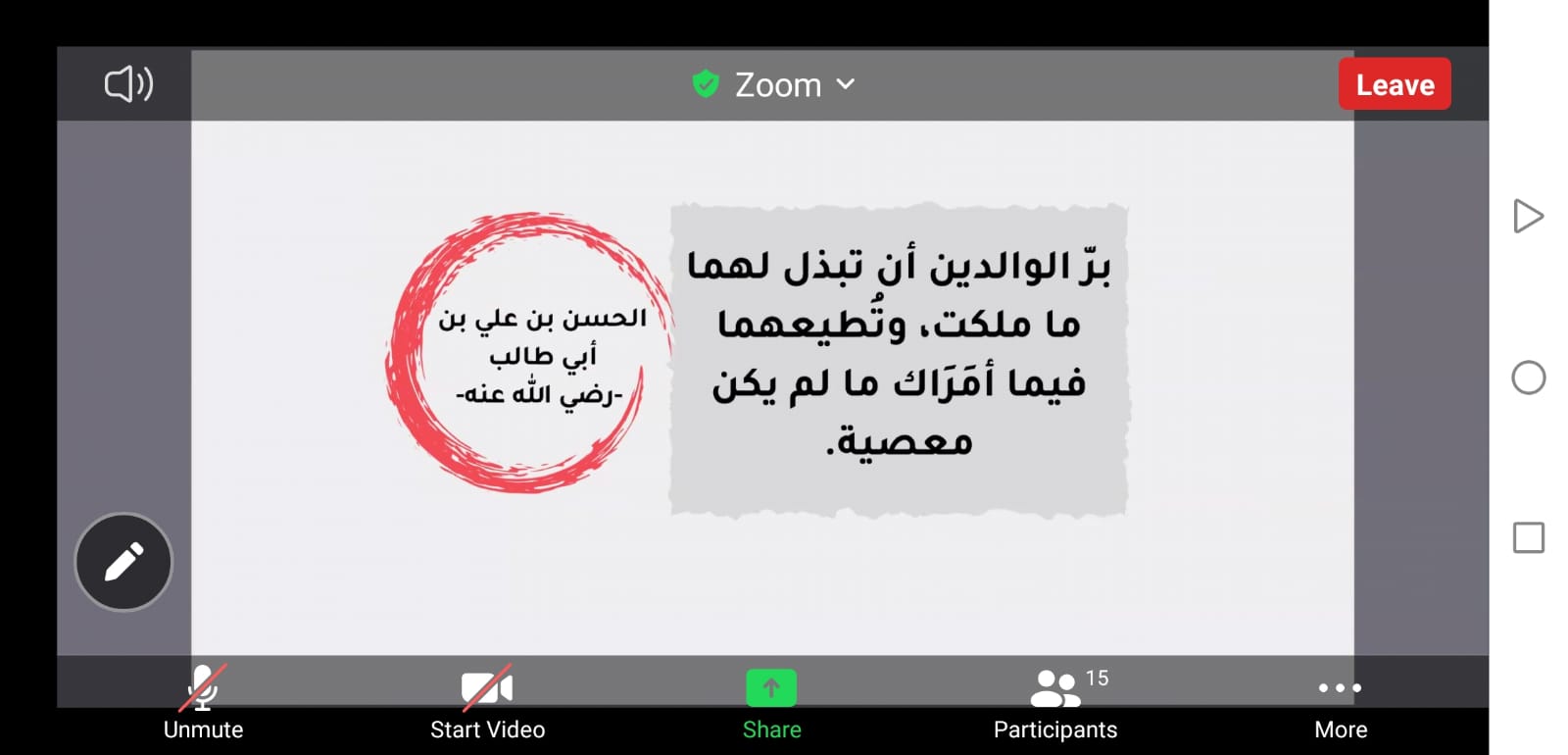 " يوم الأربعاء1443/2/29هـ الموافق 2021/10/6م - الساعة 8 م، وذلك بإشراف أ. زهراء علي عبد الله، وبحضور منسوبات العمادة وطالباتها. عرضن الطالبات فضل بر الوالدين والإحسان إليهما وحقوقهما علينا، وتحدثن عن صور وأشكال البر في حياتهما وما يكون بعد وفاتهما وهدفت هذه الفعالية الى: إن الإحسان إلى الوالدين واجب مفروض على كل شخص لأنهم السبب في وجوده في هذه الحياة بأمر من الله.