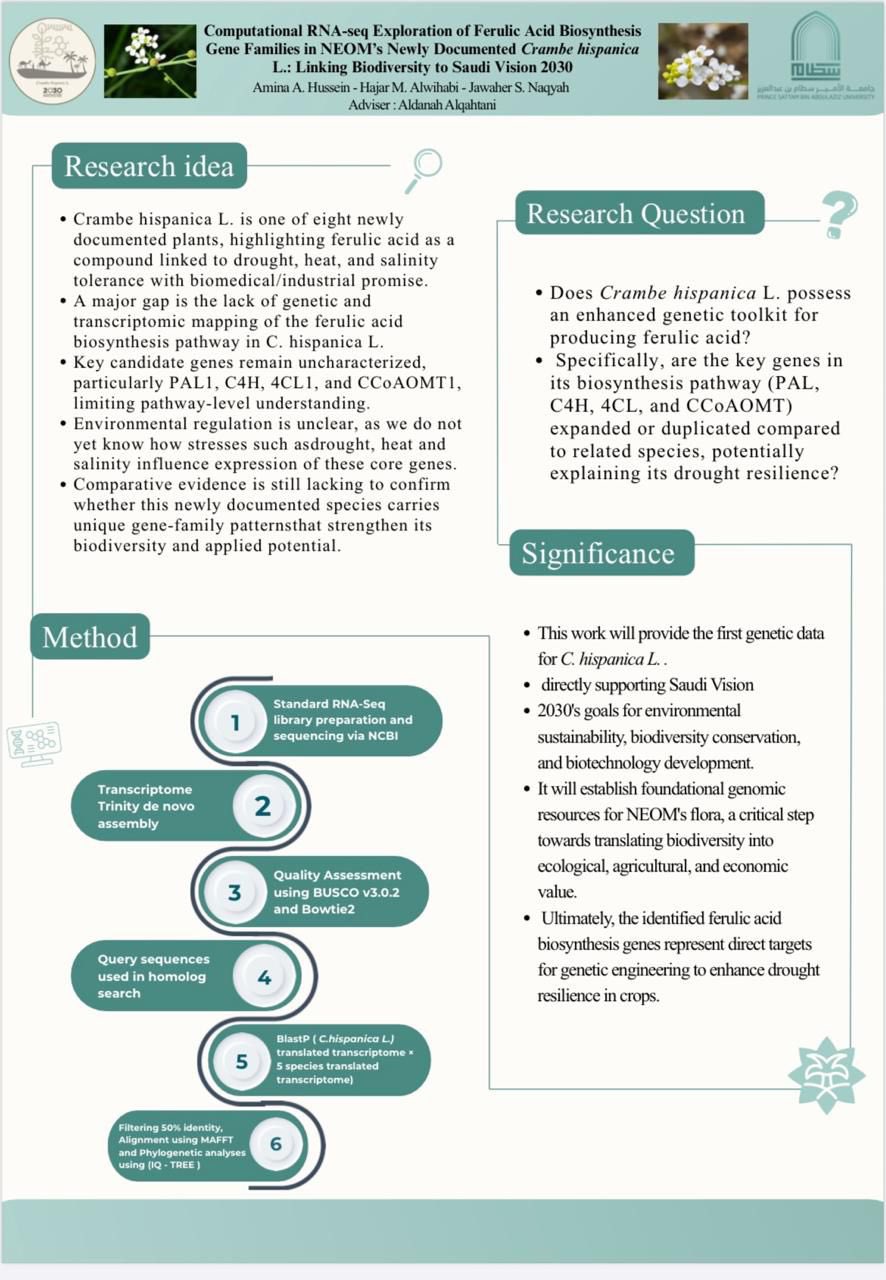 جاء هذا الإنجاز عن مشروع بحثي نوعي، استكشف حاسوبياً بيانات جينية متقدمة (RNA-seq) لعائلات جينات تصنيع حمض الفيروليك في نبات (Crambe hispanica)، وهو نبات موثّق حديثاً في منطقة نيوم.