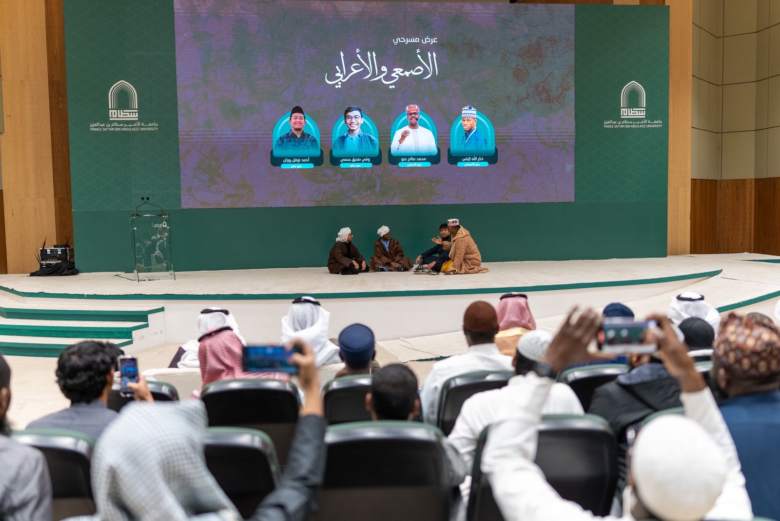 وتخلل الاحتفاء عرض مسرحي بعنوان "الأصمعي والأعرابي"، قدمته مجموعة من طلاب المنح بالجامعة، الذين جسدوا ببراعة عروضاً ثرية سلطت الضوء على المكانة العالمية للغة العربية؛ وهو ما يعكس الدور الريادي لجامعة الأمير سطام في تعليم اللغة العربية لغير الناطقين بها، وحرصها على تعزيز التقارب الثقافي والحضاري بين طلابها من مختلف الجنسيات.