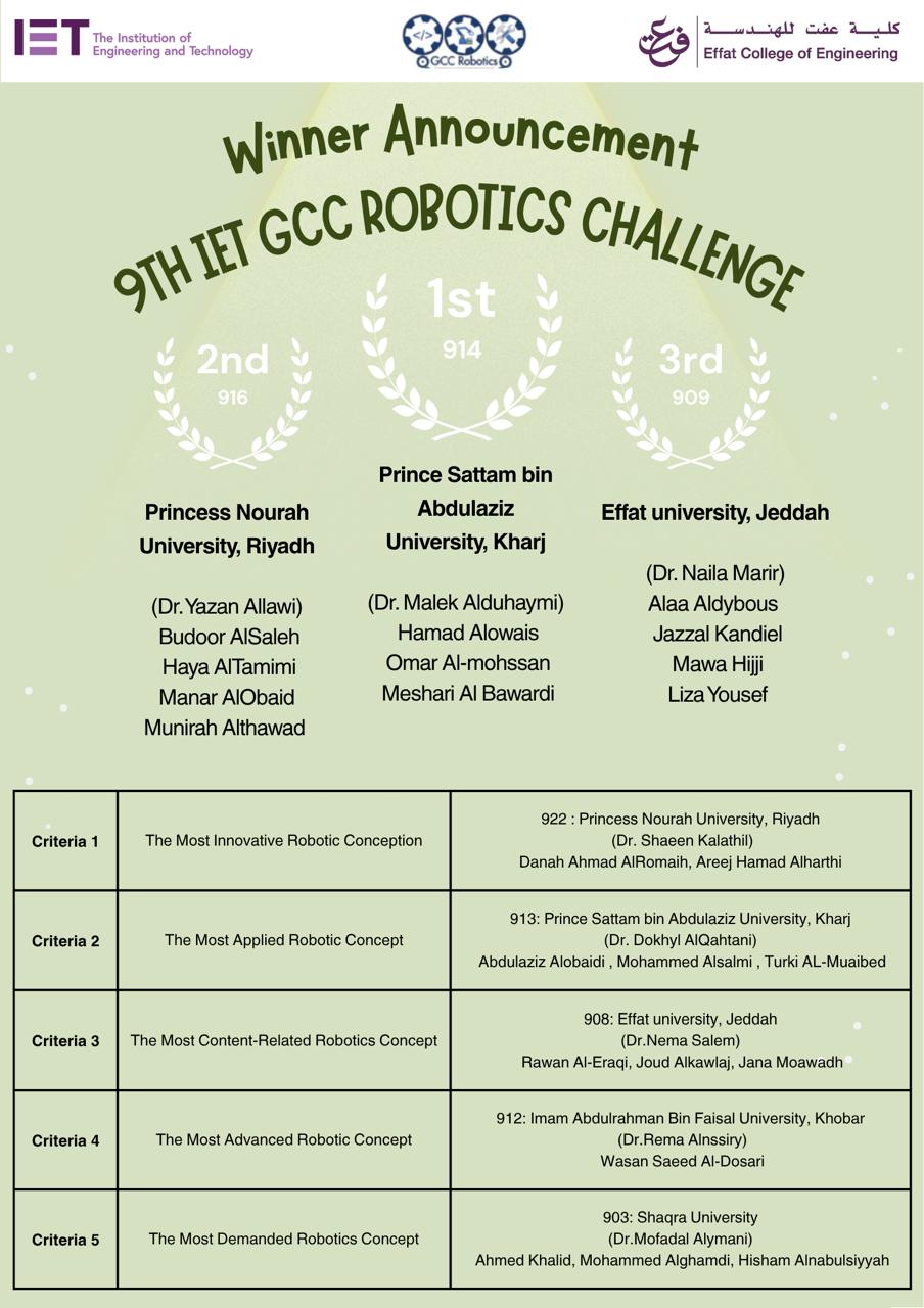 حققت جامعة الأمير سطام بن عبدالعزيز ممثلةً بكلية الهندسة، المركز الأول في الجولة المحلية السعودية للنسخة التاسعة من تحدي الروبوتات لدول مجلس التعاون الخليجي، متفوقة على جميع الجامعات السعودية المشاركة في المسابقة التي تنظمها مؤسسة الهندسة والتكنولوجيا البريطانية (IET) بالتعاون مع كلية الهندسة بجامعة عفت.