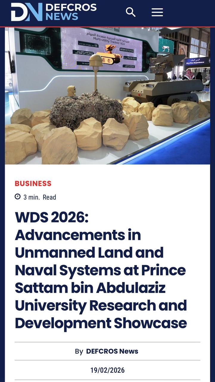 أشارت مجلة DEFCROS News المتخصصة في شؤون الدفاع والأمن في عددها الصادر بتاريخ 19فبراير 2026، في تقرير نشرته عبر منصتها الإلكترونية، إلى جناح جامعة الأمير سطام بن عبدالعزيز المشارك في معرض الدفاع العالمي 2026، مؤكدة أن ما عرضته الجامعة من أنظمة غير مأهولة برية وبحرية يعكس مستوى متقدمًا من البحث والتطوير التقني، ويجسد تحول المخرجات الأكاديمية إلى حلول تطبيقية قابلة للتصنيع والتشغيل ضمن منظومة الصناعات الدفاعية.