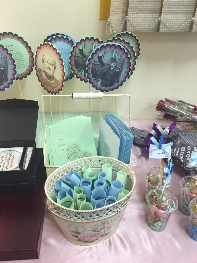 حيث بدأت الفعاليات بترتيل أيات من القرآن الكريم ثم تلى ذلك كلمة للمشرفة الإجتماعية في الكلية أ. مهره السفياني ثم كلمة للدكتورة نهله القرعان حيث تحدثت بشكل مبسط عن الصعوبات التي واجهت الطالبة أشواق الزهراني مع التأتأة حتى تخطت هذه المشكلة وكذلك تحدثت عن المساعدات التي يقدمها صندوق الطلاب للطالبات , وبعد ذلك تحدثت الطالبة أشواق عن معاناتها منذ أن كانت في الخامسة من عمرها وكذلك في مراحلها الدراسية وكيفية نظر الأخرين والمجتمع لها ومساندة والديها ومكتب الموهوبات لها في ذلك حتى توصلت بفضل الله الى إختراع جهاز يساعد على تخطي التأتأة على مستوى المملكة العربية السعودية.