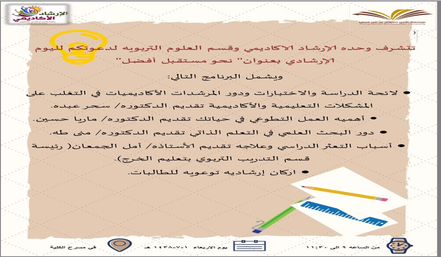 نظمت وحدة الإرشاد الأكاديمي بالتعاون مع قسم العلوم التربوية برنامج إرشادي بعنوان" نحو مستقبل أفضل" تحت إشراف أ. حسناء العتيبي ،يوم الأربعاء الموافق 1/7/1438، من الساعة 9:30 صباحاً إلى 12ظهراً ، على مسرح الكلية .