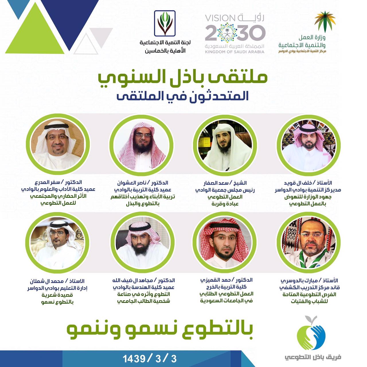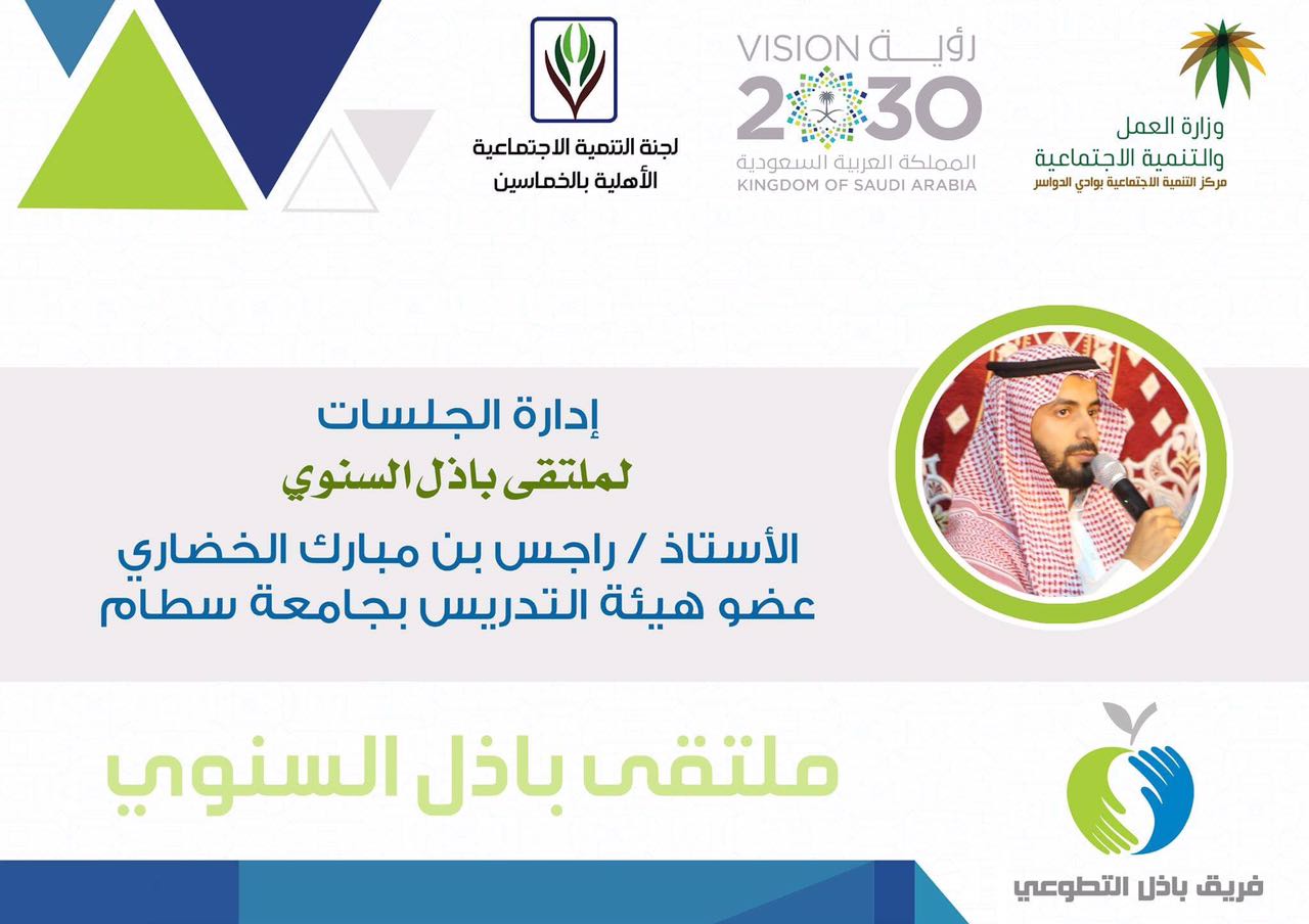 يشارك نخبة من منسوبي جامعة الأمير سطام بن عبدالعزيز بملتقى باذل التطوعي الذي تنظمه لجنة التنمية الاجتماعية الأهلية بالخماسين والتابعة لوزارة العمل والتنمية الاجتماعية والذي سيقام بعد صلاة العشاء يوم الثلاثاء الموافق 3/3/1439هـ بالقاعة التنموية باللجنة بأوراق عمل حيث سيشارك كلا من :