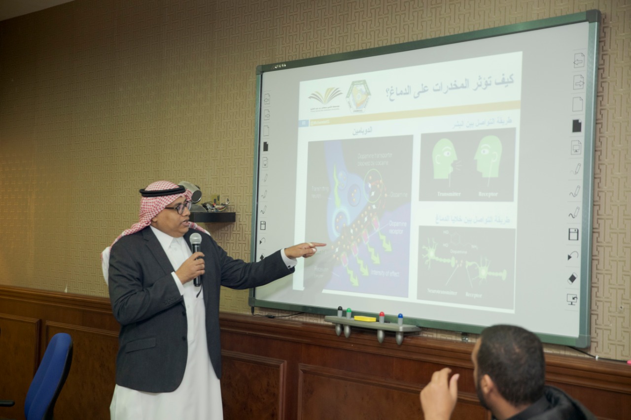 نظمت لجنة العمل المشترك مع المديرية العامة لمكافحة المخدرات في الجوانب التدريبية والتوعوية ومكافحة التدخين بالجامعة صباح يوم الثلاثاء 17 / 6 / 1441هـ بقاعة تدريب كبار الشخصيات بالمدينة الجامعية ورشة " العصف الذهني لاقتراح برامج الوقاية من التدخين والمخدرات" بمشاركة نخبة من طلاب كليات الجامعة.