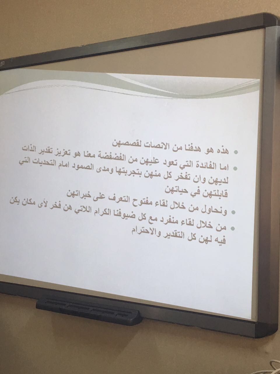 وقد اختتم البرنامج بلقاء موسع وممتع مع عميدة الكلية د. حنان مانع الجهني حكت فيه مسيرتها التعليمية والعملية بكل ظروفها المحيطة، وسط انصات وتشوق وانجذاب الحضور للاستفادة مما يطرح.