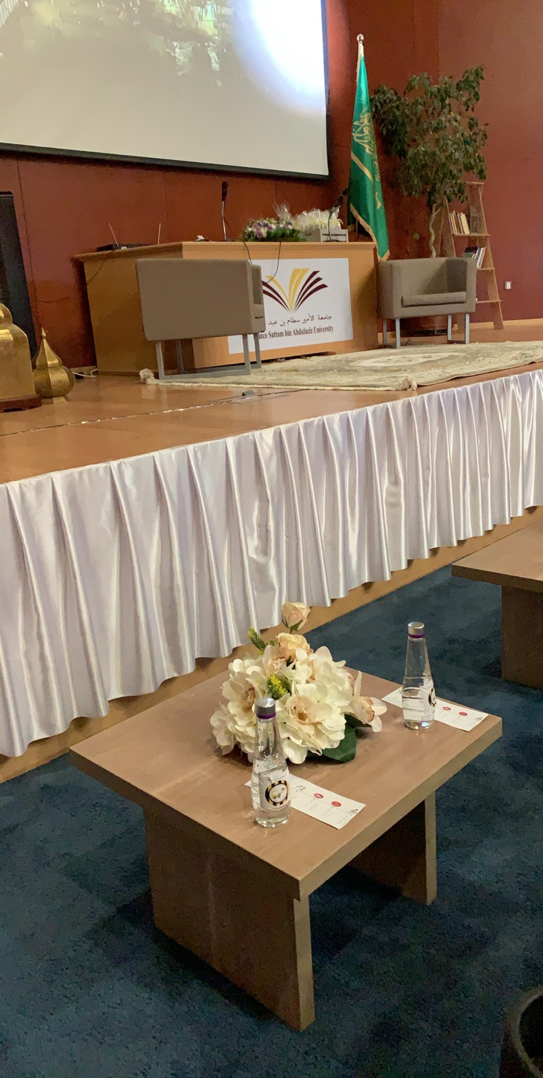 وبحضور معالي وكيلة الجامعة لشؤون الطالبات د. بشرى الحماد وسعادة : وكيلة عمادة شؤون الطلاب وكالة الطالبات د. دلال المطرفي وبرعاية كريمة من عميدة الكلية د. مليحة القحطاني وبتشريف من بعض أمهات المشاركات على المسرح.