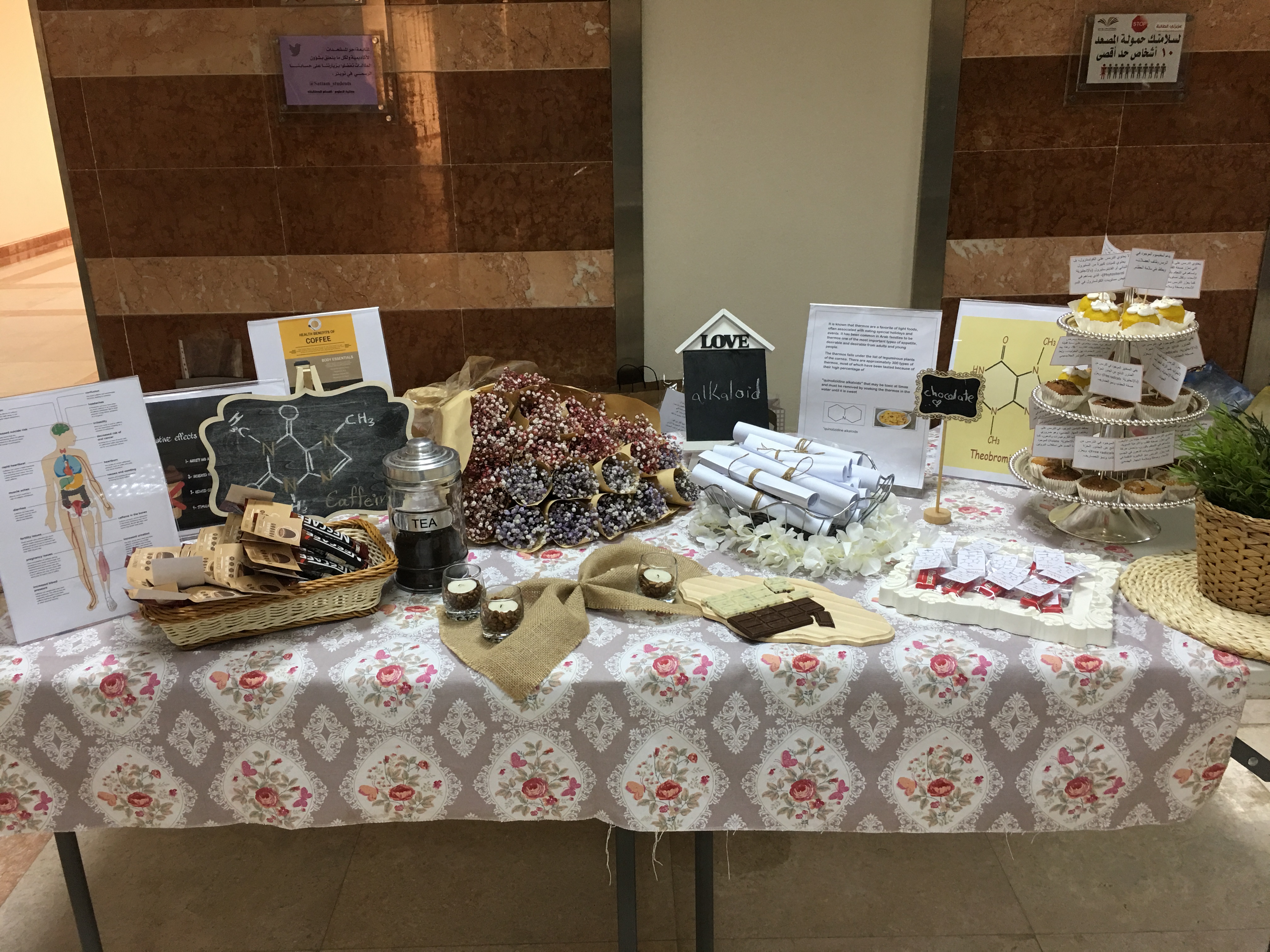 - ركن الألكالويد حيث تم عرض منتجات طبيعية تحتوي على هذا المركب منها (الكافيين) وهو موجود في الطبيعة ويوجد في النبات ويستخدم الكافيين كمبيد حشري ويعمل في الإنسان كمنبه للجهاز العصبي وهو أكثر المنشطات استخدمًا في العالم ومن أهم مصادره القهوة والشاي، (الشوكولاتة) ويوجد في الشكولاتة مادة الثيوبرومين مركب قاعدي من نبات الكاكاو مشابه لمادة الكافيين في التركيب فقط كما أن الشوكولاتة تساعد في التخلص من دهون البطن، (الترمس) من الأطعمة الخفيفة المحببة للكثيرين يندرج الترمس تحت لائحة البقوليات وهو من فصيلة القرنية.